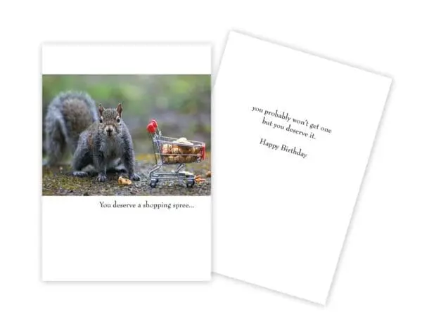 5″ x 7″ with white envelope. INSIDE: you probably won’t get one but you deserve it. Happy birthday. Printed in Canada