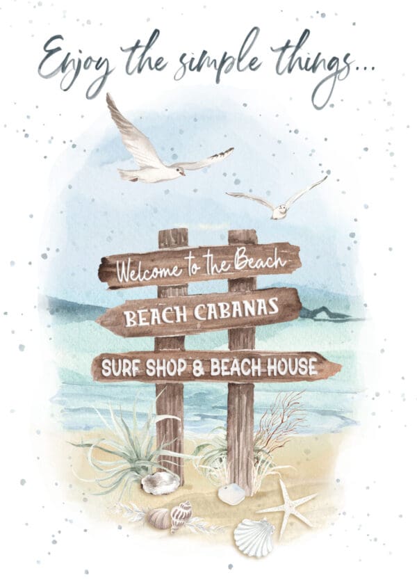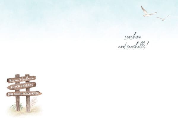Full size card measuring 5×7″ is printed in Canada with full colour on the interior & exterior. Each card includes an envelope and wrapped in cellophane. INSIDE: Sunshine and seashells!