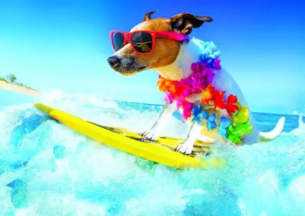 5″ x 7″ with white envelope INSIDE: Soak pup the sun. Happy Birthday. Card has glitter embellishments.