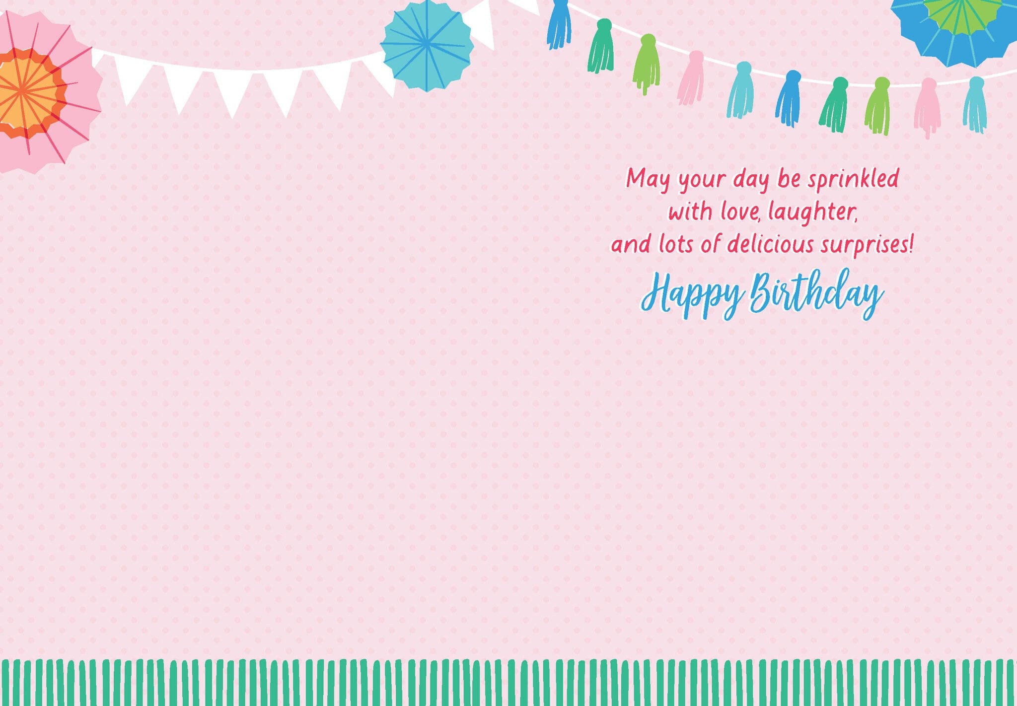 4.5″x6.25″, printed on smooth paper, with coordinating envelope. Printed in Canada. Inside greeting: May your day be sprinkled with love, laughter, and lots of delicious surprises! Happy Birthday
