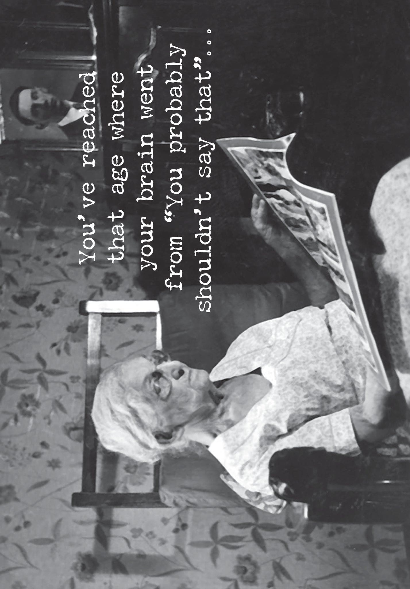 A humorous 4.75″ x 7″ greeting card lending a vintage photograph to coordinate with its outside. INSIDE: to “Wha the hell, let’s see what happens.” Printed in Canada.