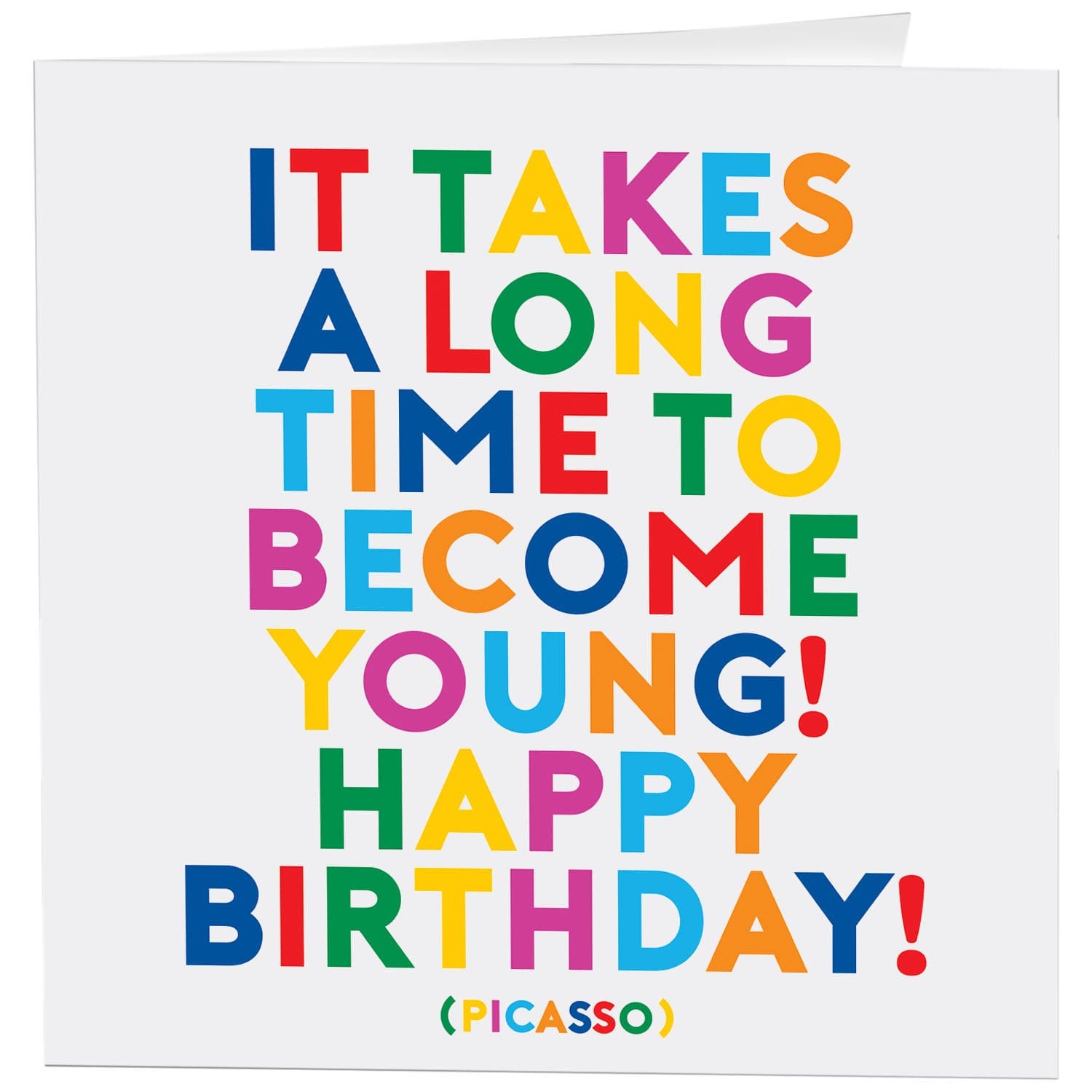 5″ square greeting card. Printed in Canada on recycled paper. Inside: it takes a long time to become young! happy birthday!