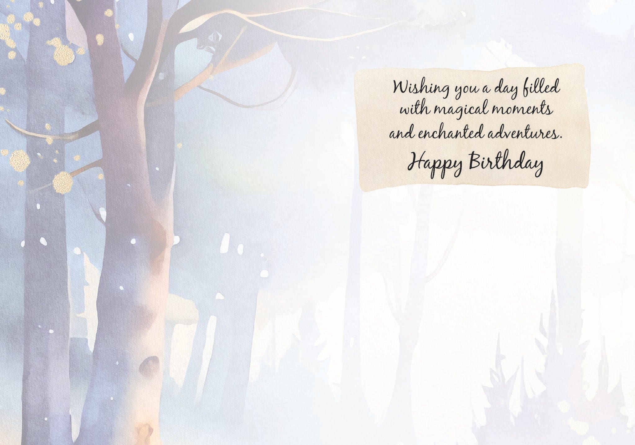 Each card measures 5″x7″ (13cmx18cm) and is printed in full colour on coated paper, comes with a coordinating colour envelope. Printed in Canada. INSIDE: Wishing you a day filled with magical moments and enchanted adventures. Happy Birthday