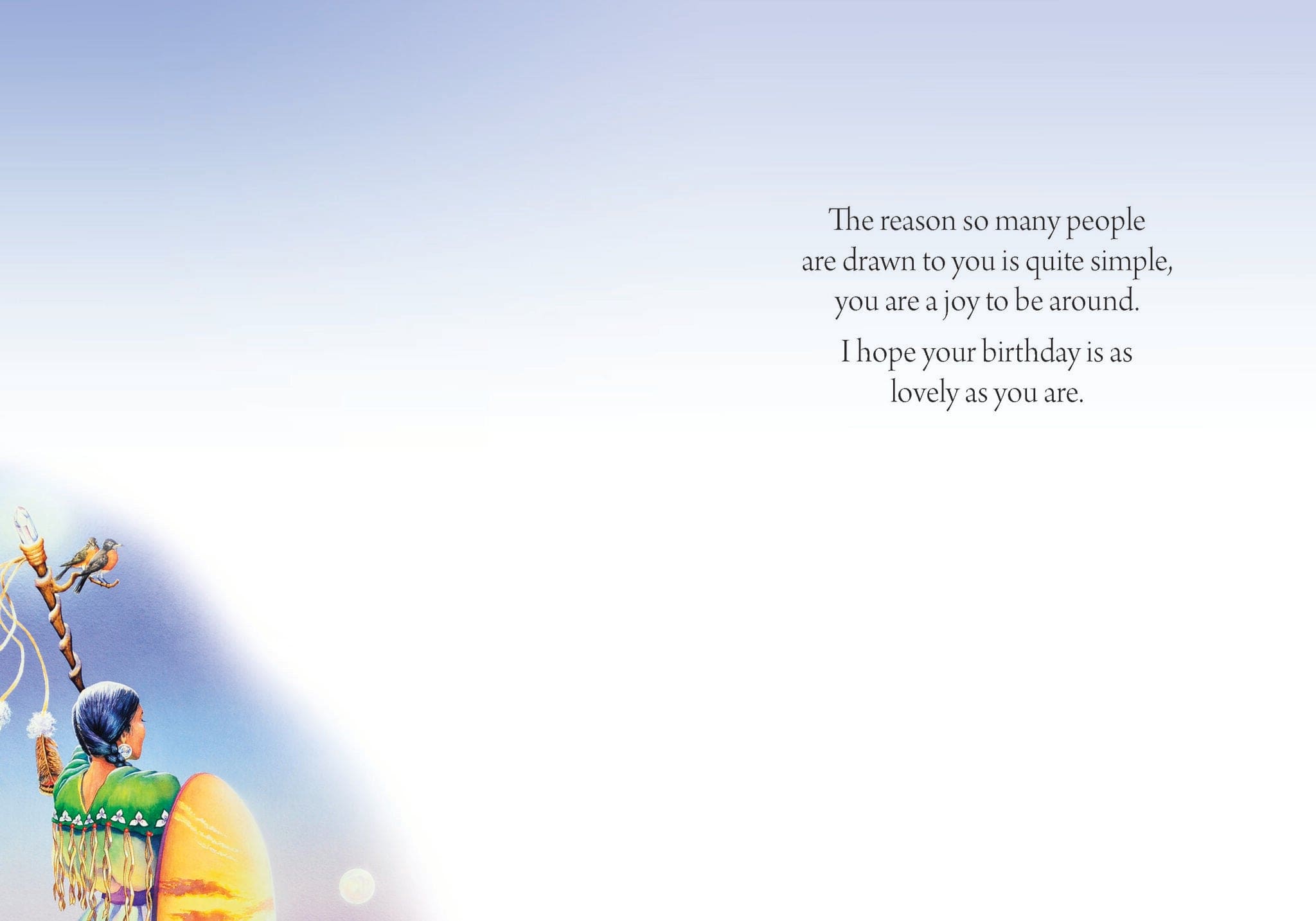 Card measures 5″x7″ printed in full col on linen paper with a coordinating envelope. Printed in Canada. Inside: The reason so many people are drawn to you is quite simple, you are a joy to be around. I hope your birthday is as lovely as you are.