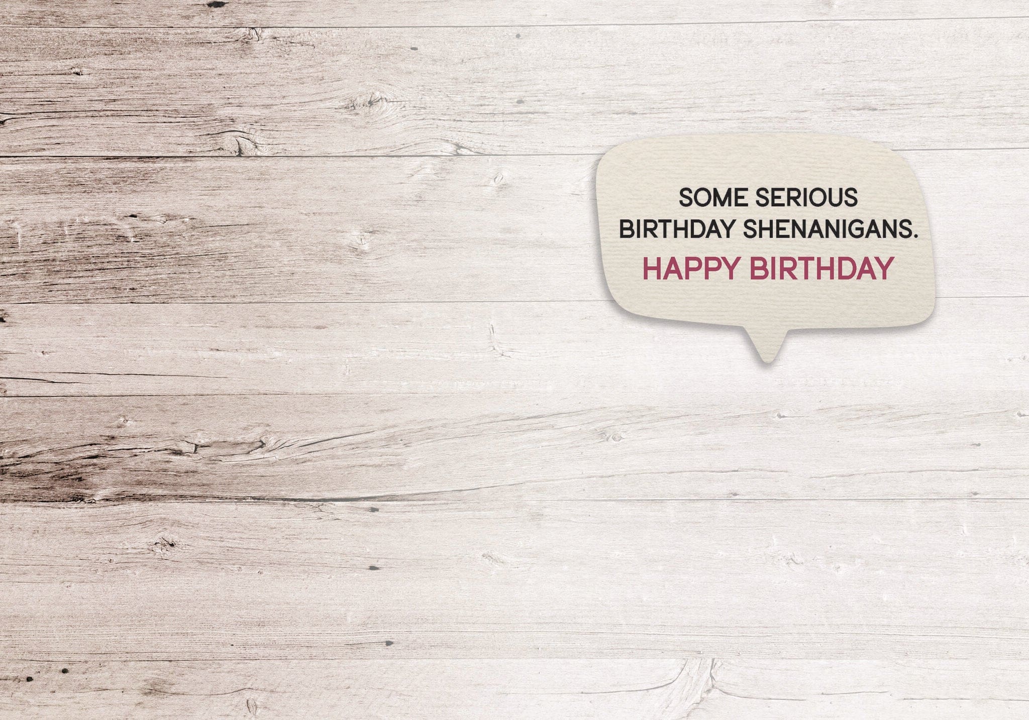 Each card measures 5″x7″ (13cmx18cm) and is printed in full colour on coated paper, comes with a coordinating colour envelope. Printed in Canada. INSIDE: some serious birthday shenanigans. Happy Birthday
