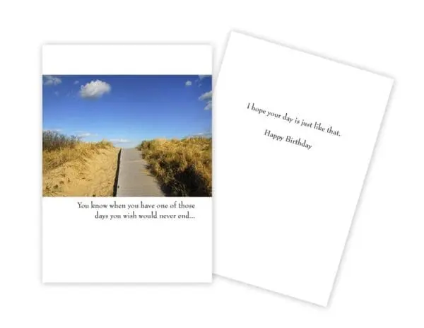5″ x 7″ with white envelope. INSIDE: I hope your day is just like that. Happy Birthday. Printed in Canada