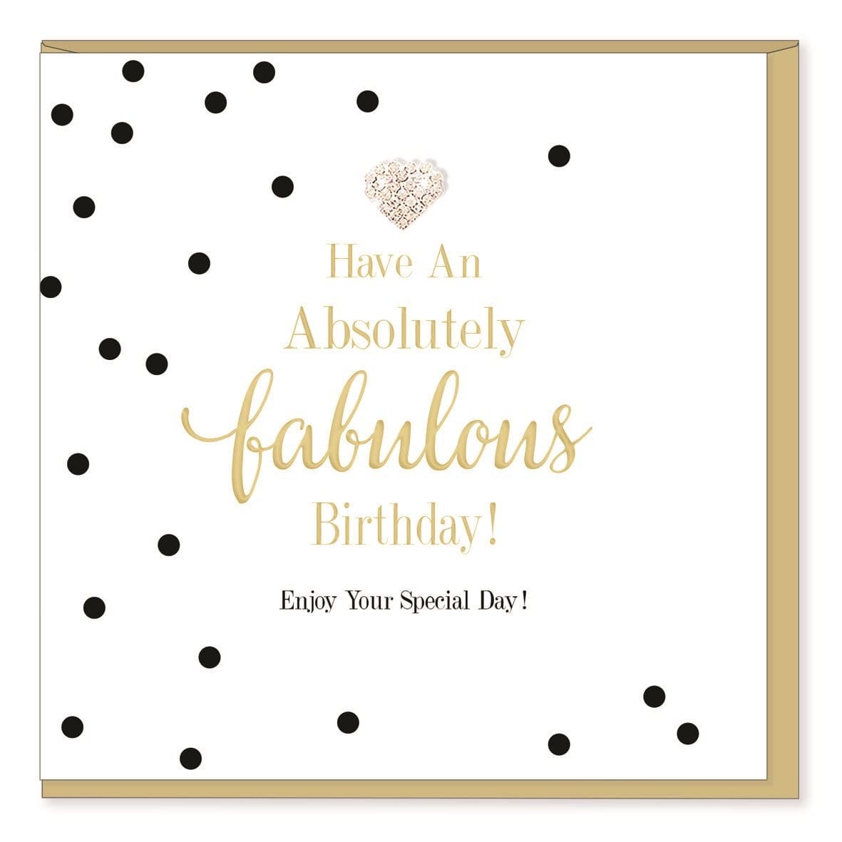Mad Dots Cards. This 15cm x 15cm greeting card is printed on cardstock, features gold foil details and is embellished with a diamante jewel. Cellophane wrapped with a pearlescent gold envelope. Made in England. INSIDE: Blank
