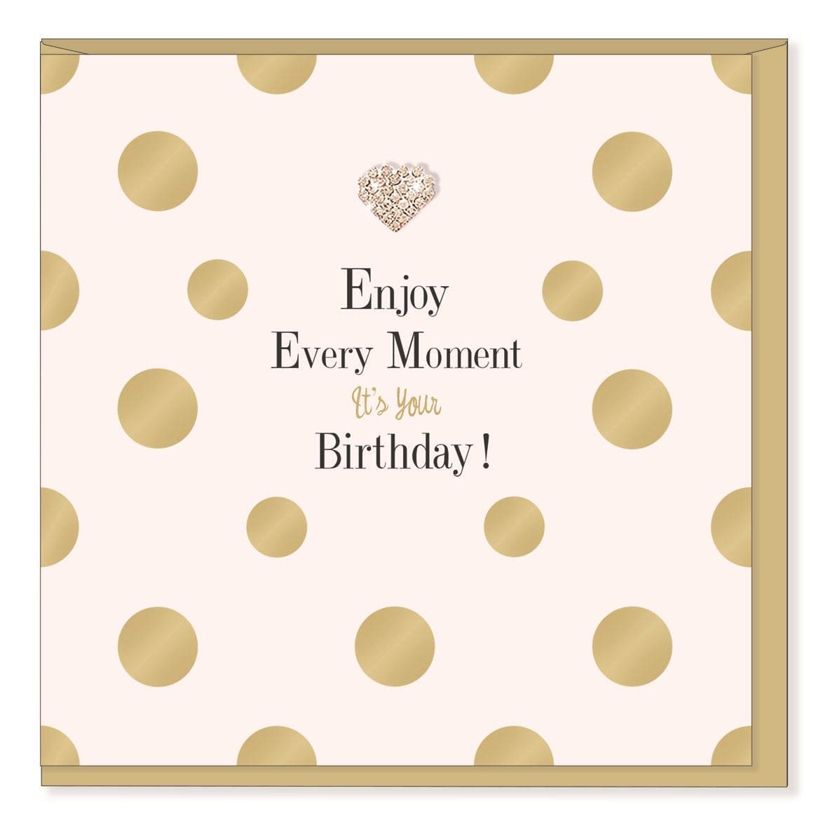 Mad Dots Cards. This 15cm x 15cm greeting card is printed on cardstock, features gold foil details and is embellished with a diamante jewel. Cellophane wrapped with a pearlescent gold envelope. Made in England. INSIDE: Blank