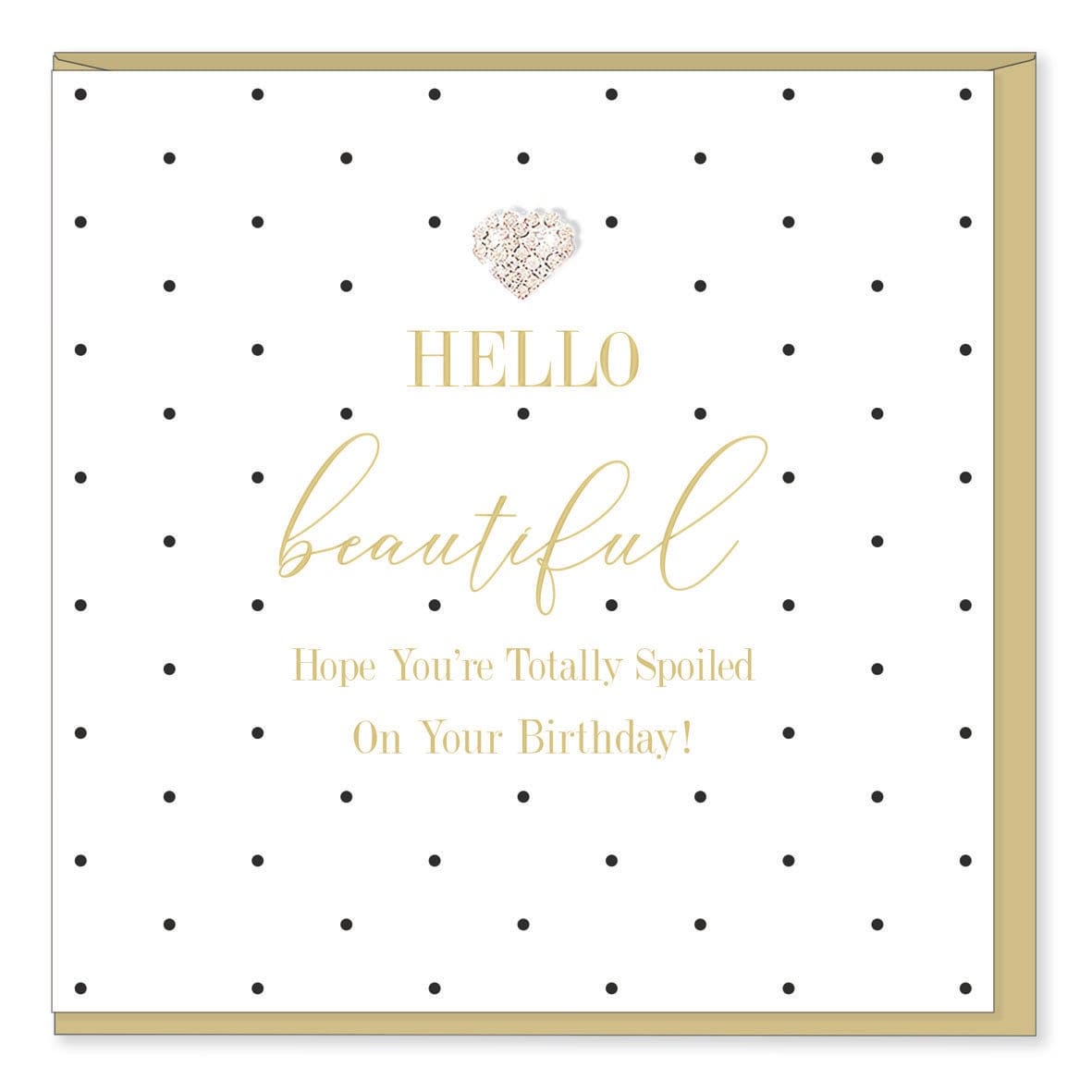 Mad Dots Cards. This 15cm x 15cm greeting card is printed on cardstock, features gold foil details and is embellished with a diamante jewel. Cellophane wrapped with a pearlescent gold envelope. Made in England. INSIDE: Blank