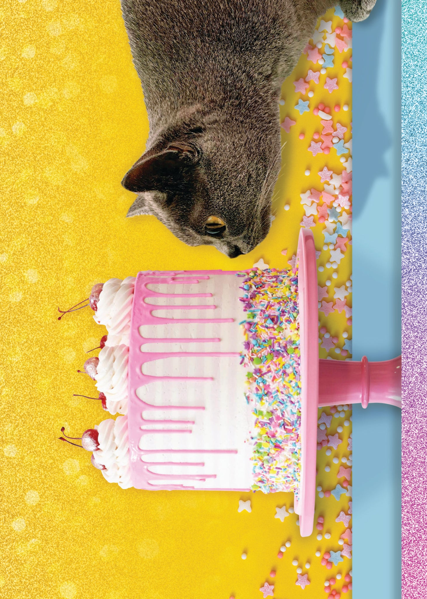 Carte 5″ x 7″ imprimée sur du papier couché couleur. À l’intérieur: Vas-y et mange le gâteau. C’est le temps de te faire plaisir! Joyeux anniversaire Imprimé au Canada.