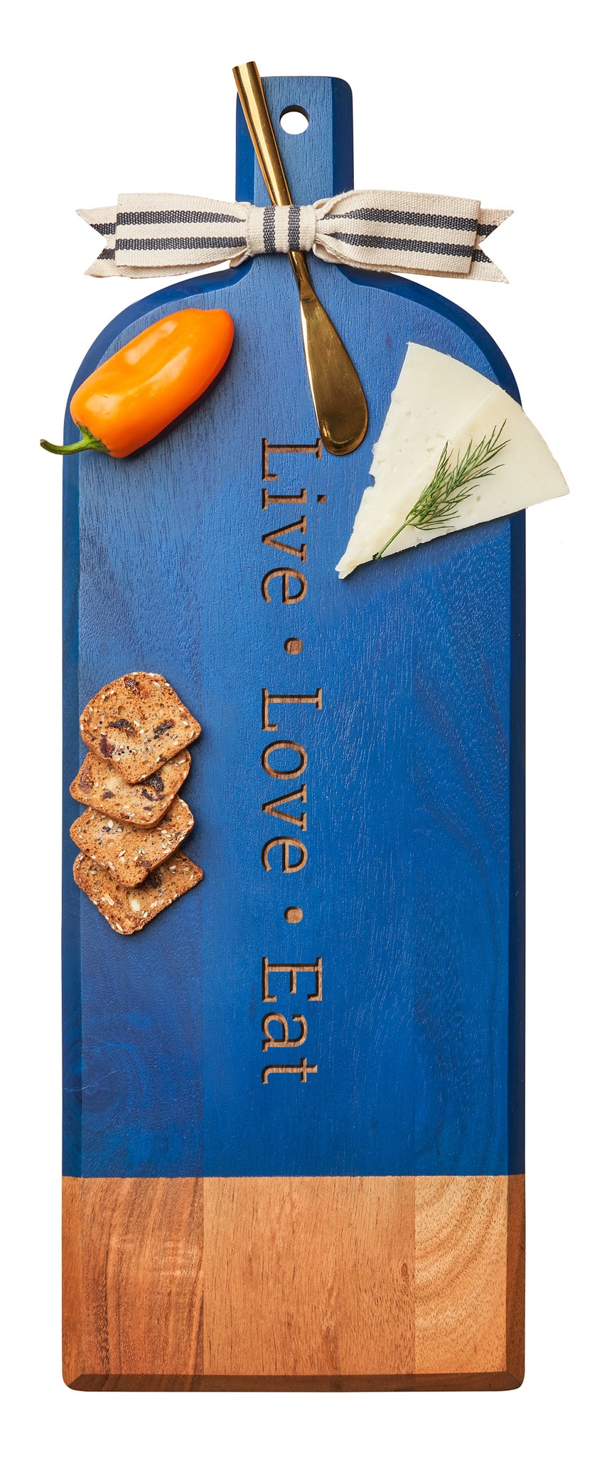 20 x 7 x .6″ Acacia Bevel Board – Long – Blue w/ Gold Spreader & bow