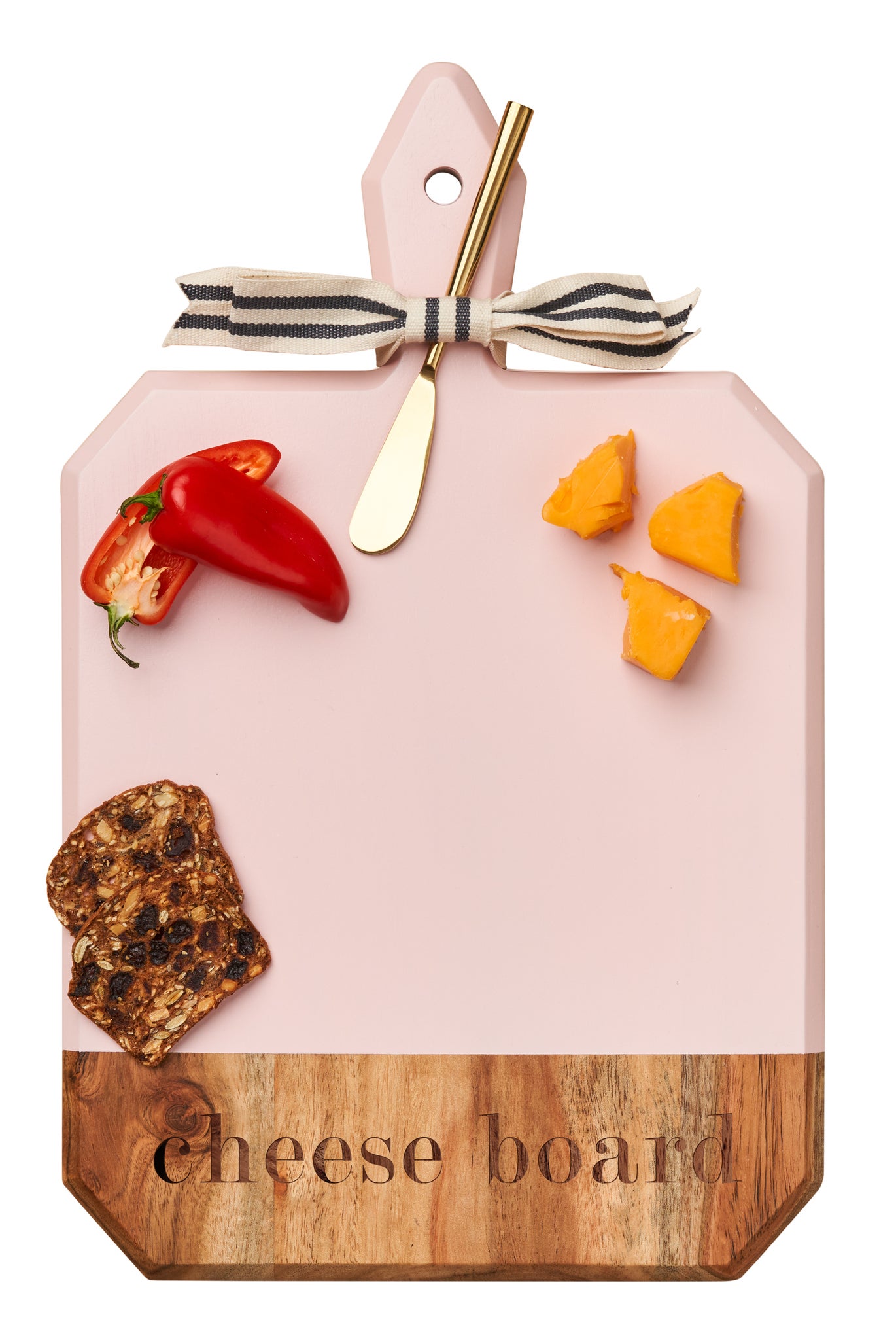 16 x 10” Acacia Heirloom Board Rectangle w/ Gold Spreader & Ribbon – Pink – Cheese Board