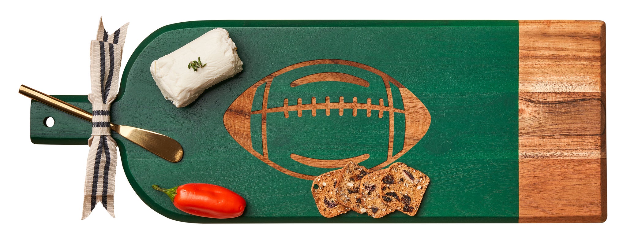 20 x 7” Acacia Bevel Board Green w/ Ribbon & Gold Spreader Knife – Football
