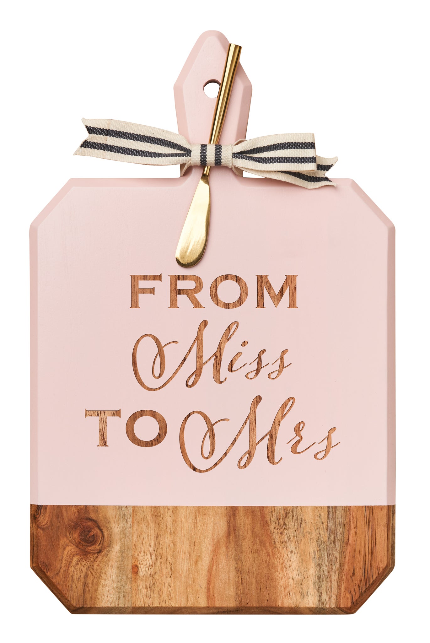 16 x 10” Acacia Heirloom Board Rectangle w/ Gold Spreader & Ribbon – Pink – From Miss to Mrs