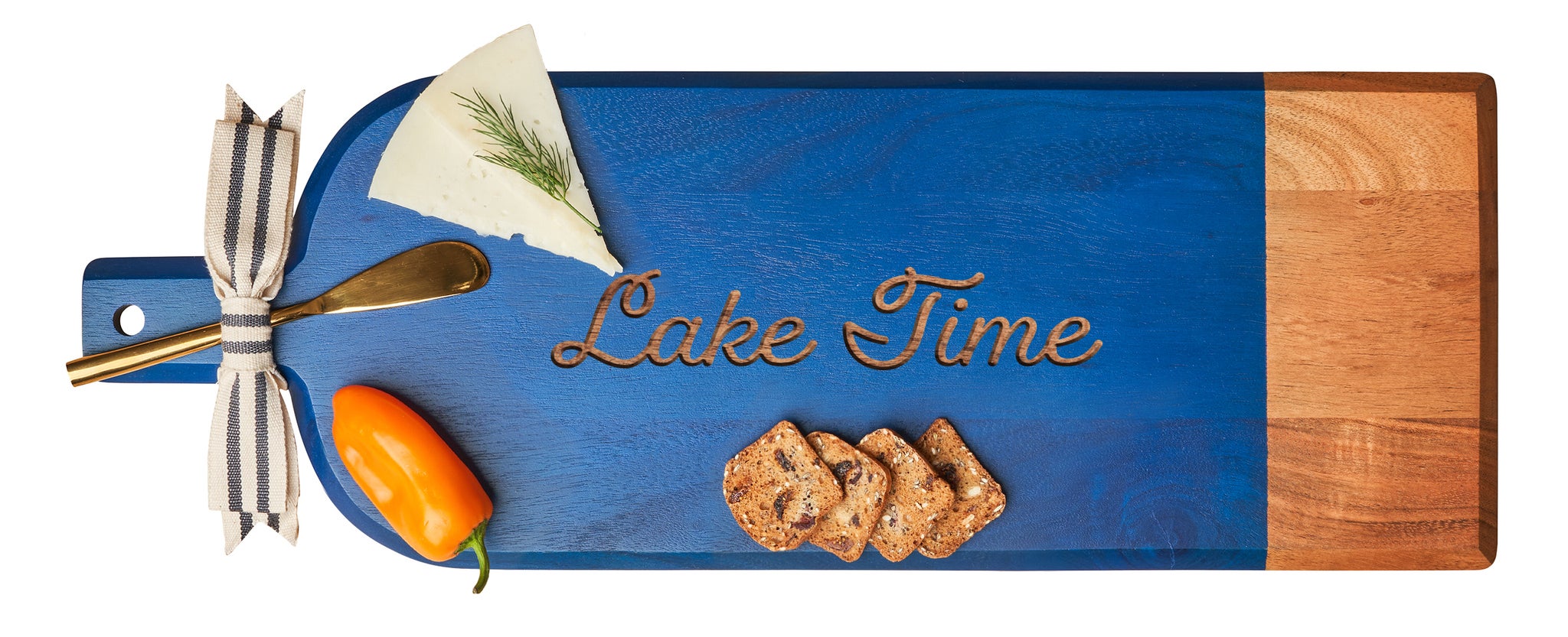 20 x 7” Blue Acacia Bevel Board Long w/ Gold Spreader & Ribbon – Lake Time