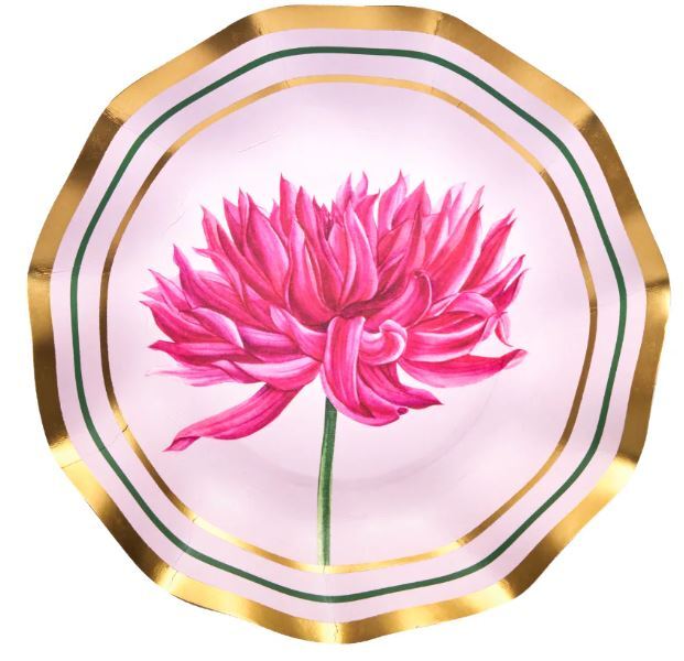 Elevate your dining experience with the Dahlia Garden 6.5″ Paper Plate, featuring a stunning dahlia bloom design in soft pink hues accented with a stunning gold metallic trim. Includes 8 bowls per pack.