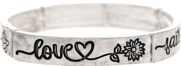 Silver Faith, Believe, Grace, Love Bracelet. Product materials may include zinc, brass and steel with silver and rhodium plating. Lead safe.