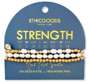 A Morse Code dot is one bead & a dash is the pearl. Start at the small gold spacer bead & follow the spelling around the bracelet! L 6.75″ | Stretches to 7.5″ Made with Gold PVD plated beads, pearls, elastic. Set includes 3 bracelets.