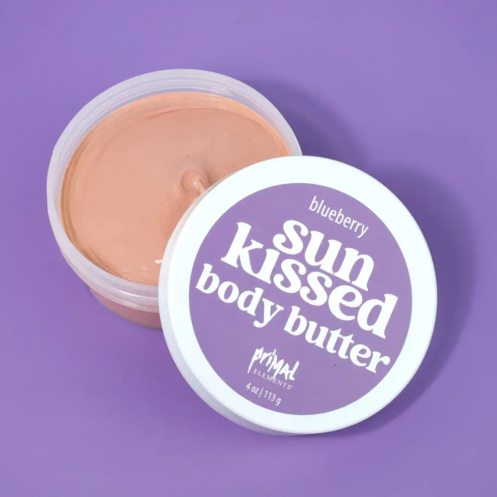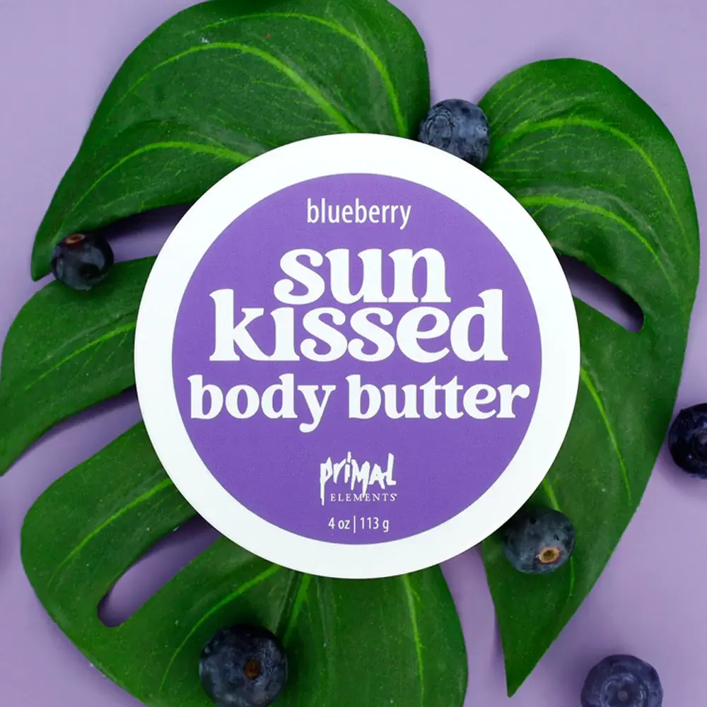 Sun Kissed Body Butter, skin-loving moisturizer with natural shimmers that give a summer glow all year long. Scent: Blueberry. Bursting with the notes of fresh picked blueberries. 133g (4oz)