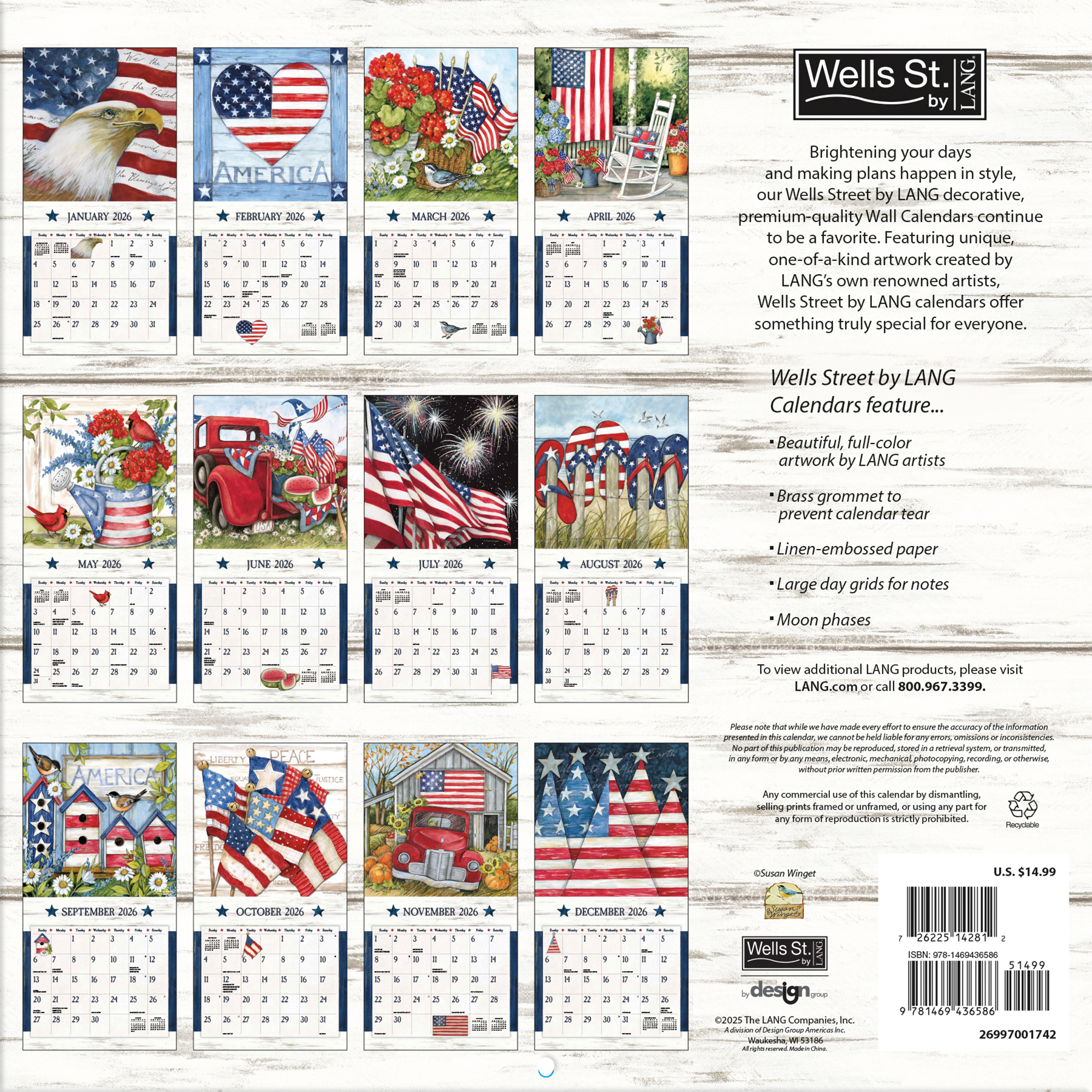 Wells St. by LANG Wall Calendars feature monthly full color images based on hand-painted originals, elegant linen-embossed paper stock, and a brass grommet for hanging.