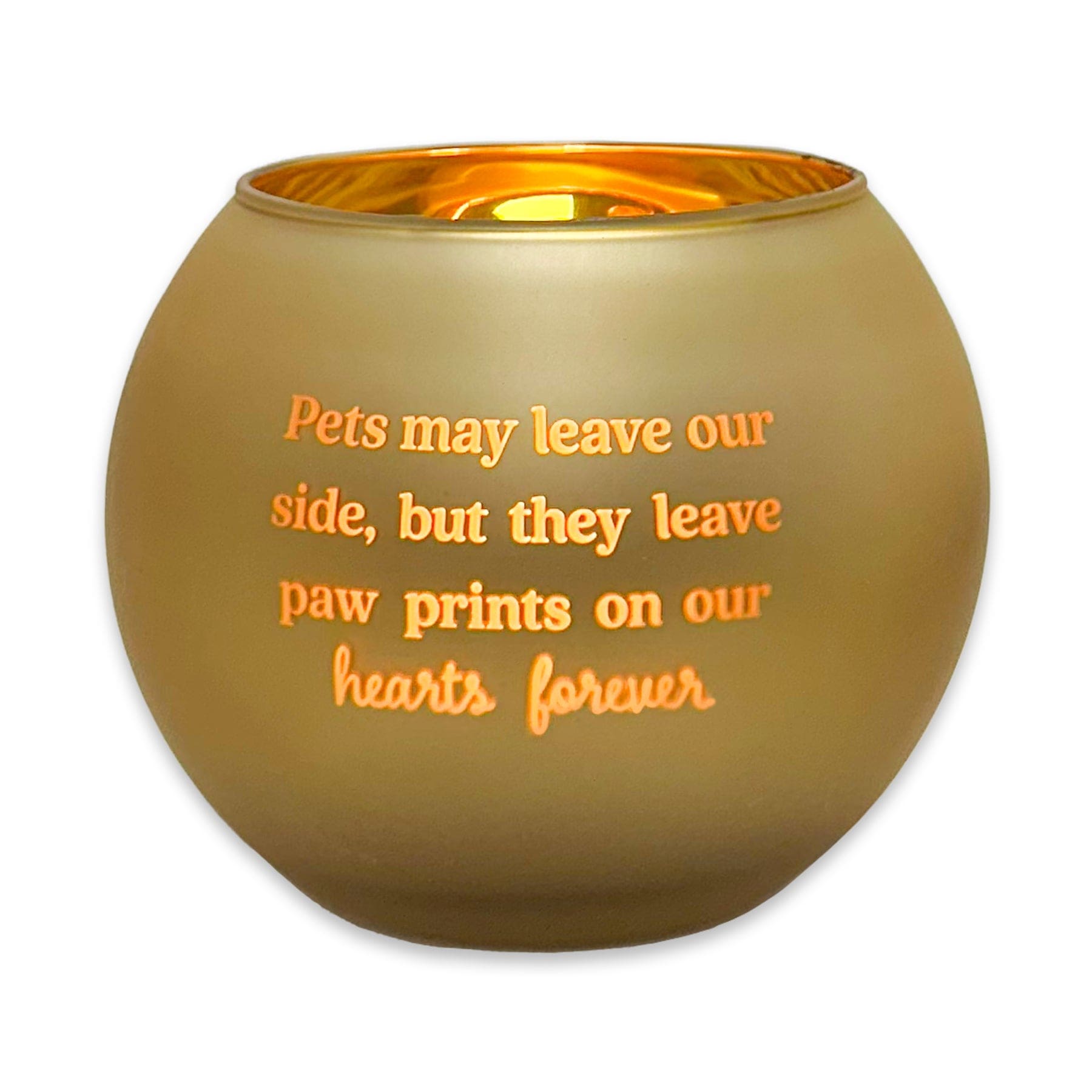 Candle Holder Size 3.75″ w x 3.125″ h Message inside: Pets may leave our side, but they leave paw prints on our hearts forever