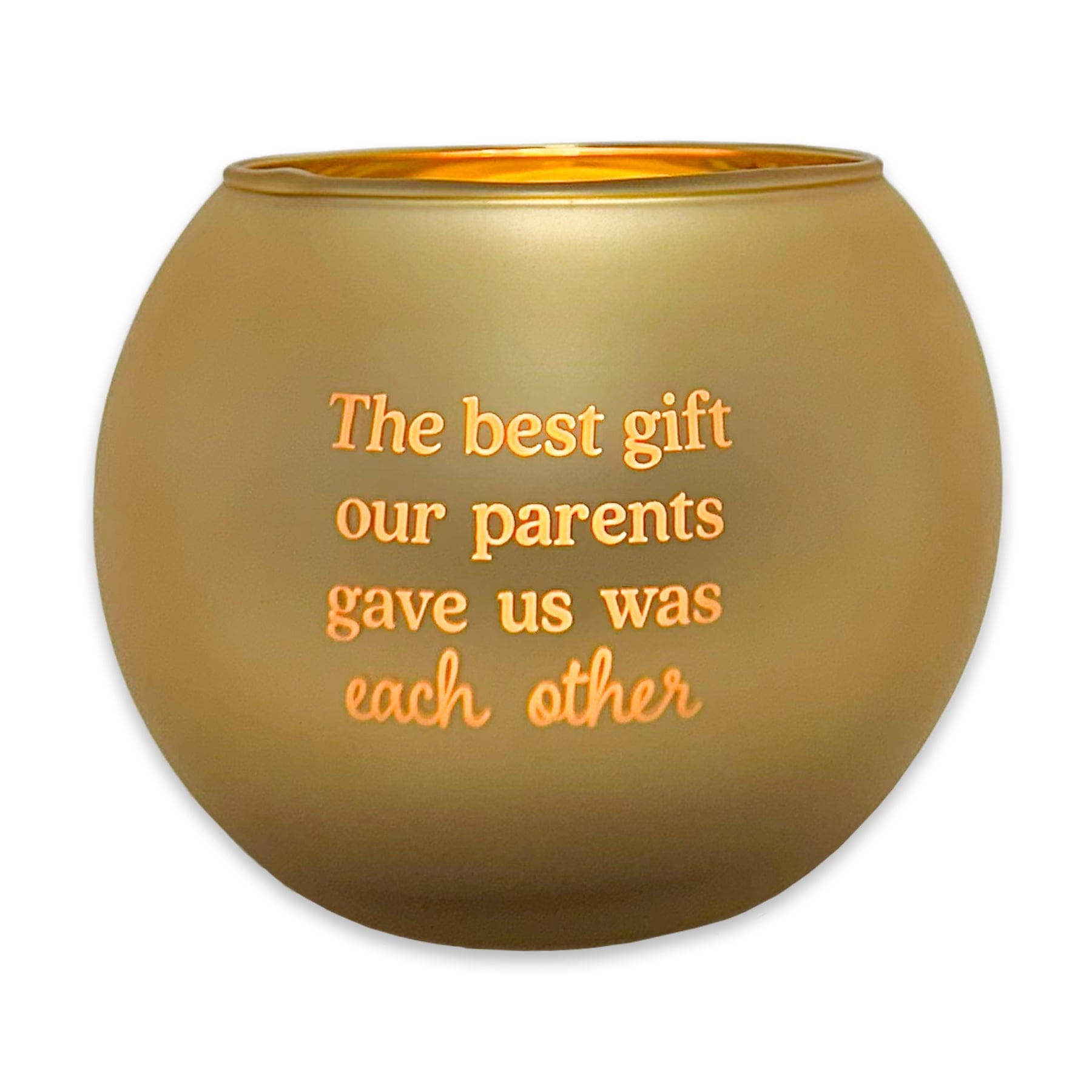Candle Holder Size 3.75″ w x 3.125″ h Message inside: The best gift ur parents gave us was each other