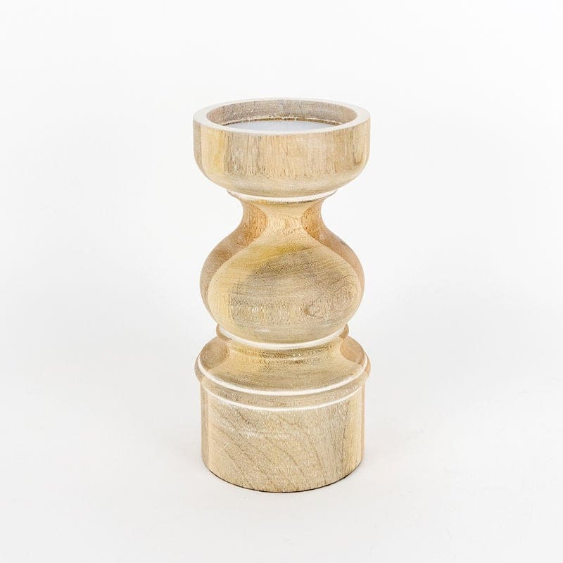 3.75″x 8″x 3.75″ Mango Wood Candle Holder, Natural/White. Mango wood pieces are carved from the mango tree, a sustainable hardwood from India. The visible colors and grain variance make each piece beautiful and unique.