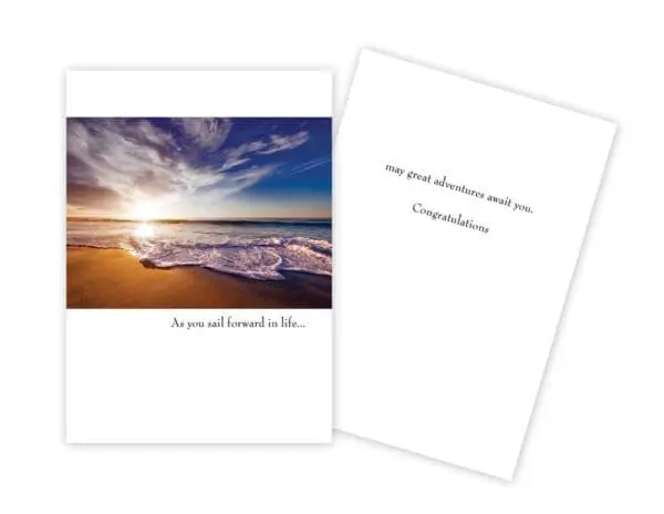 5″ x 7″ with white envelope. INSIDE: May great adventures await you. Congratulations. Printed in Canada