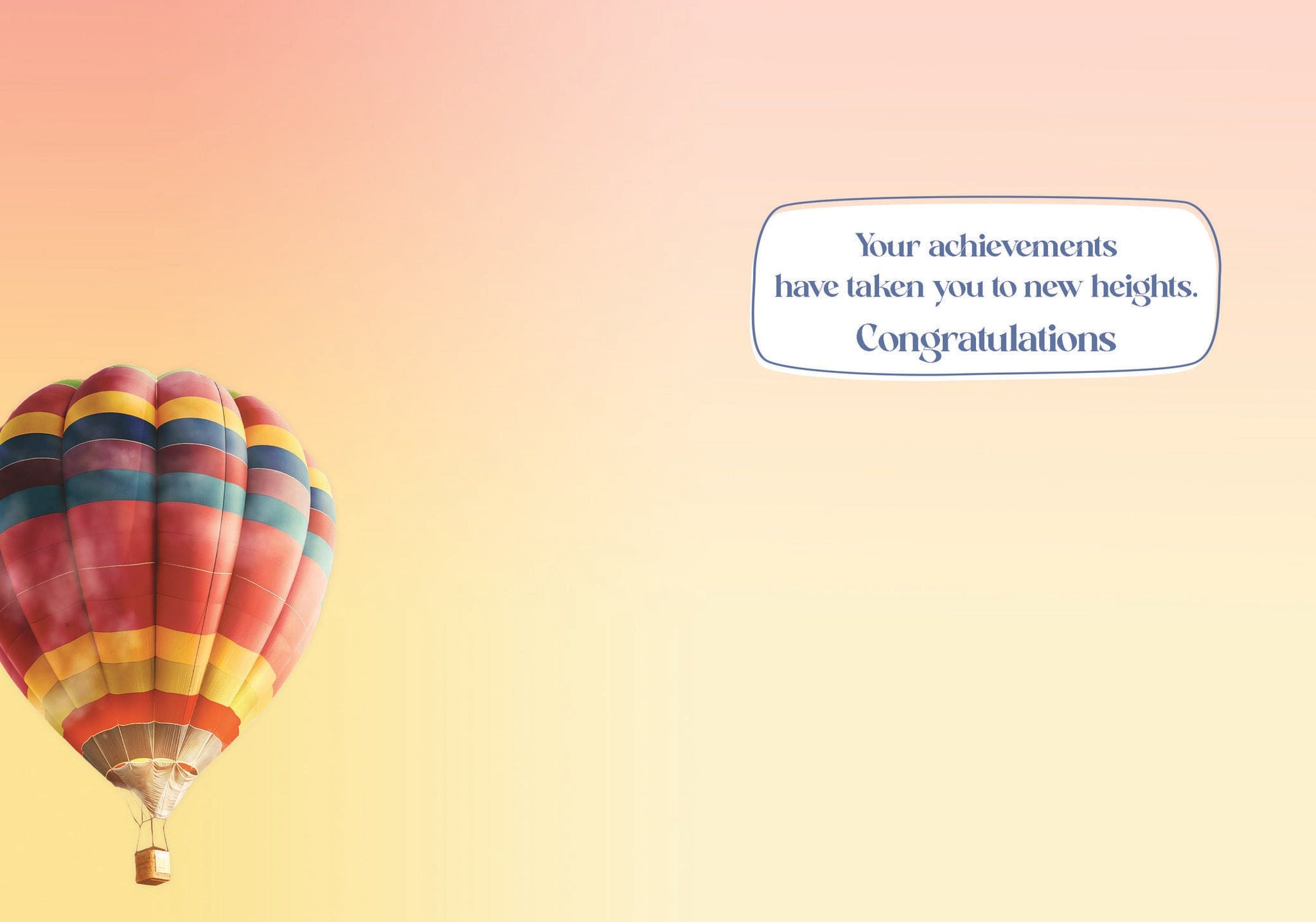 Each card measures 5″x7″ (13cmx18cm) and is printed in full colour on coated paper, comes with a coordinating colour envelope. Printed in Canada. INSIDE: Your achievements have taken you to new heights. Congratulations