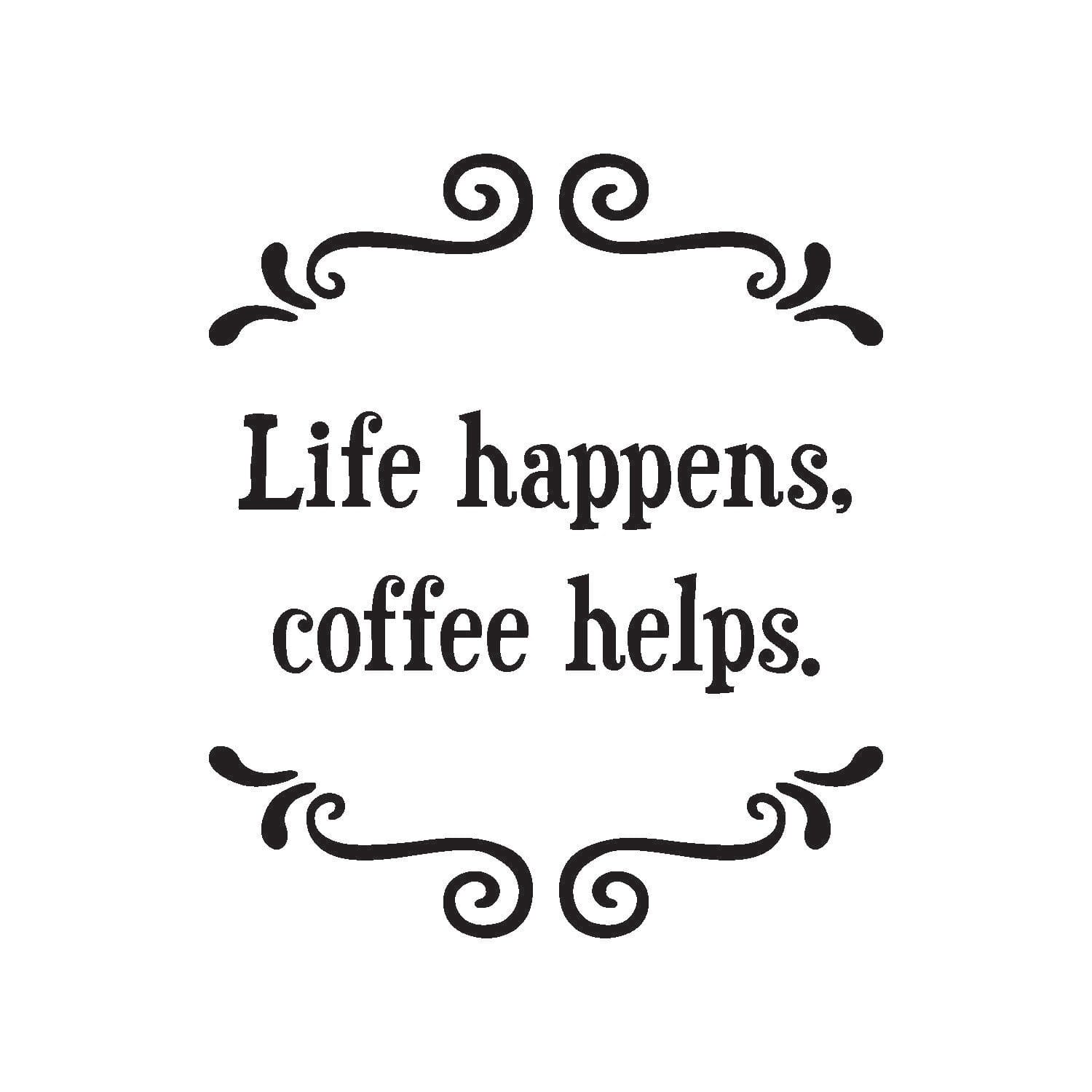 Size: 3.8125 x 3.8125 Heavy duty, durable melamine with a smooth and shiny surface that is easy to clean. Each coaster is backed with protective cork. Text: Life happens, coffee helps.