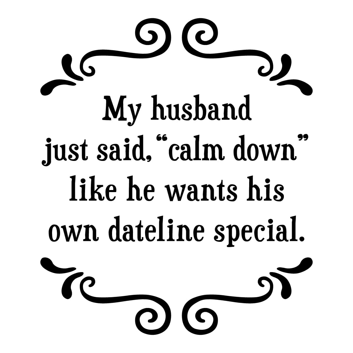 Size: 3.8125 x 3.8125. Heavy duty, durable melamine with a smooth and shiny surface that is easy to clean. Each coaster is backed with protective cork. TEXT: My husband just said “Calm down” like he wants his own dateline special.