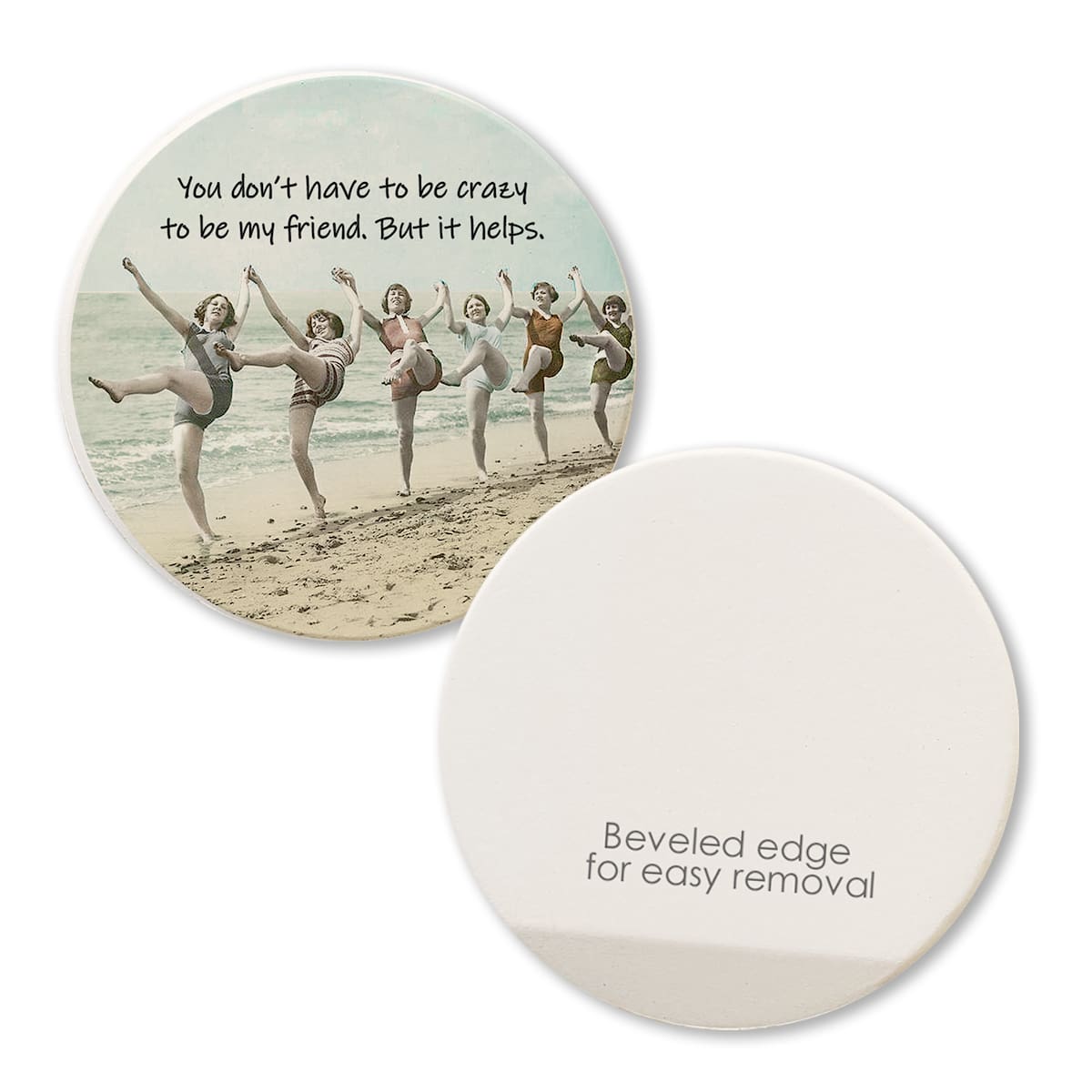 Keep your cup holders clean and dry with these 2.75″ round absorbent car coasters. Permanently printed with high resolution graphics and humorous sayings that won’t fade or wear off. Made in America of absorbent ceramic. Fits most cup holders.