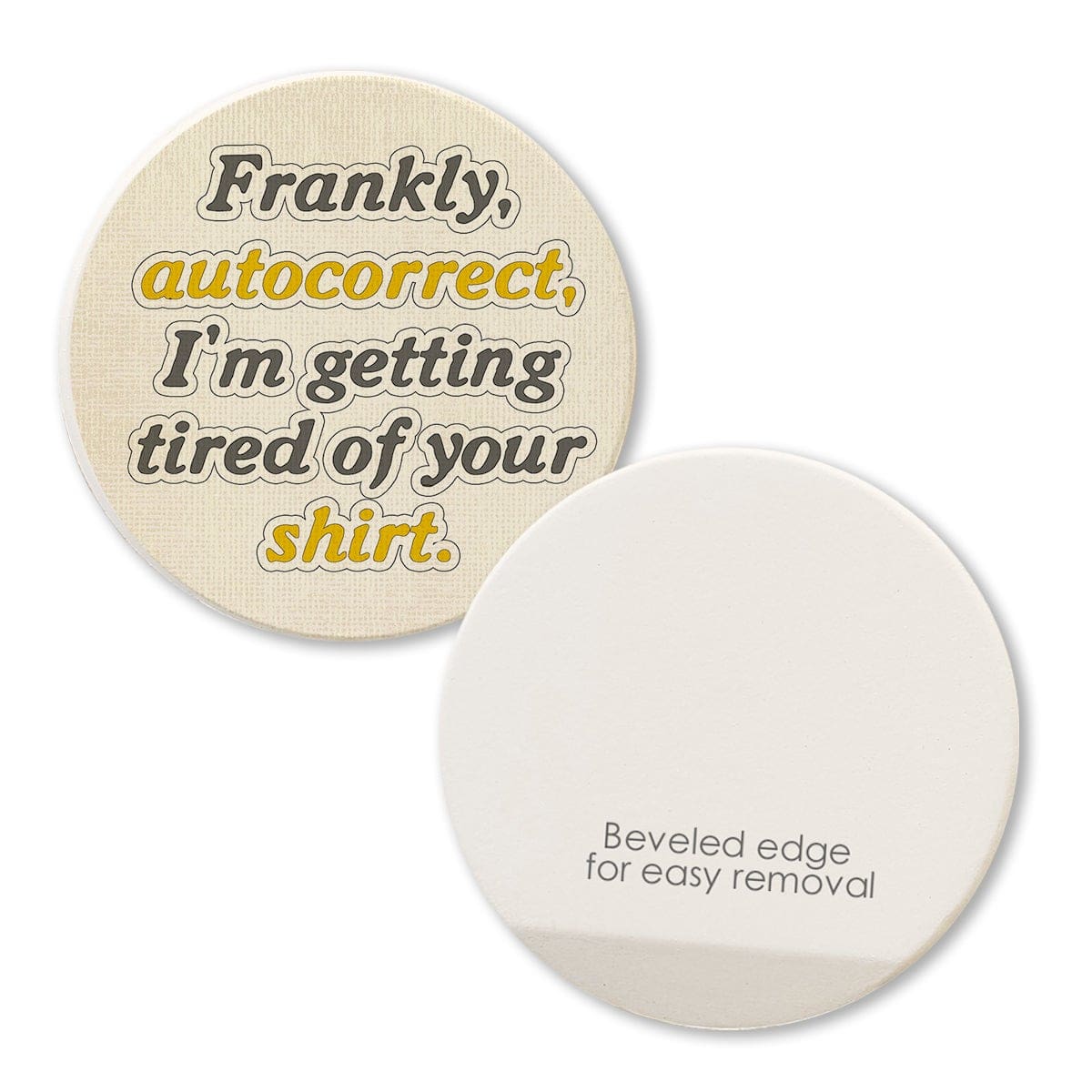 Keep your cup holders clean and dry with these 2.75″ round absorbent car coasters. Permanently printed with high resolution graphics and humorous sayings that won’t fade or wear off. Made in America of absorbent ceramic. Fits most cup holders.
