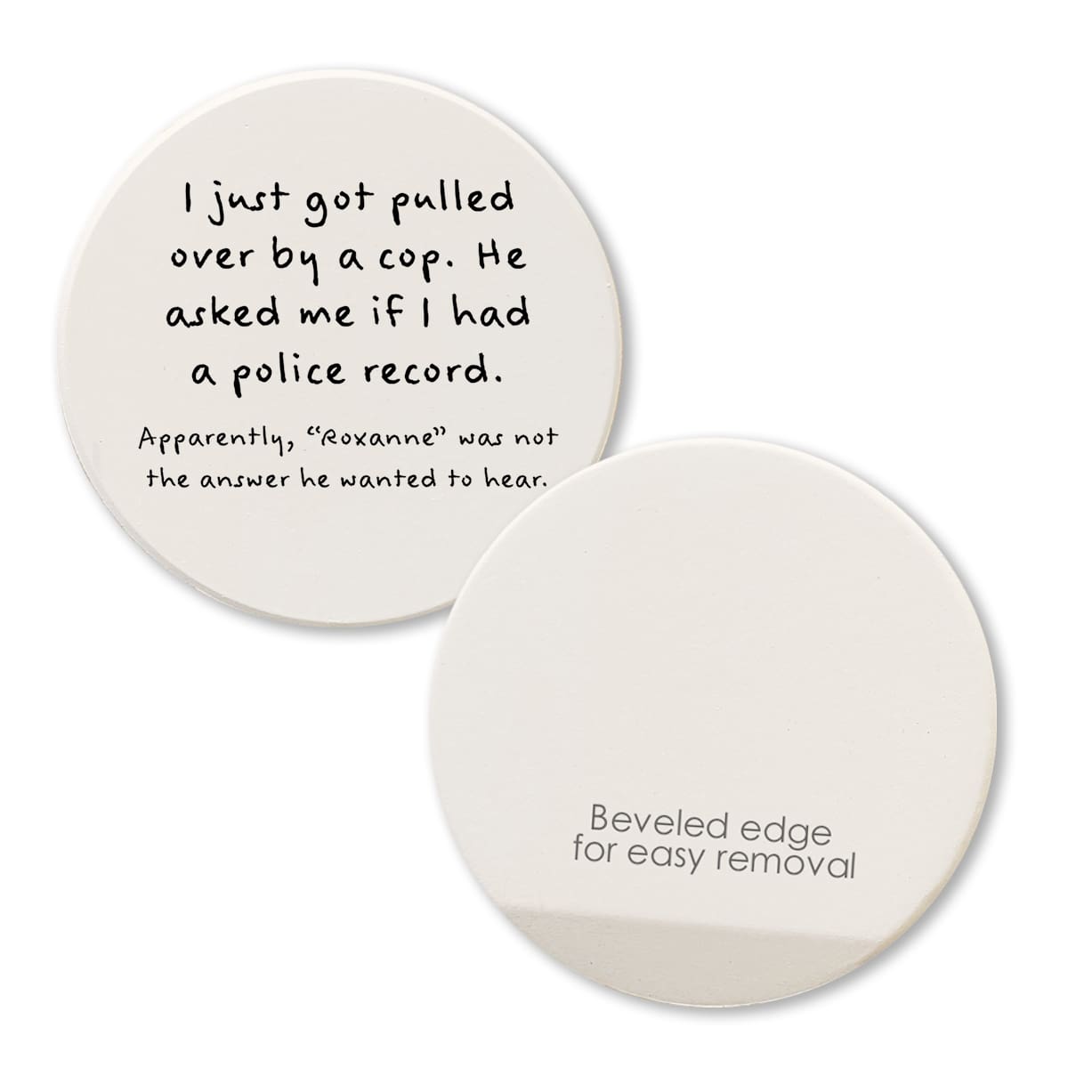 Keep your cup holders clean and dry with these 2.75″ round absorbent car coasters. Permanently printed with high resolution graphics and humorous sayings that won’t fade or wear off. Made in America of absorbent ceramic. Fits most cup holders.