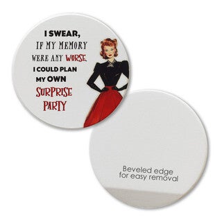 Keep your cup holders clean and dry with these 2.75″ round absorbent car coasters. Permanently printed with high resolution graphics and humorous sayings that won’t fade or wear off. Made in America of absorbent ceramic. Fits most cup holders.