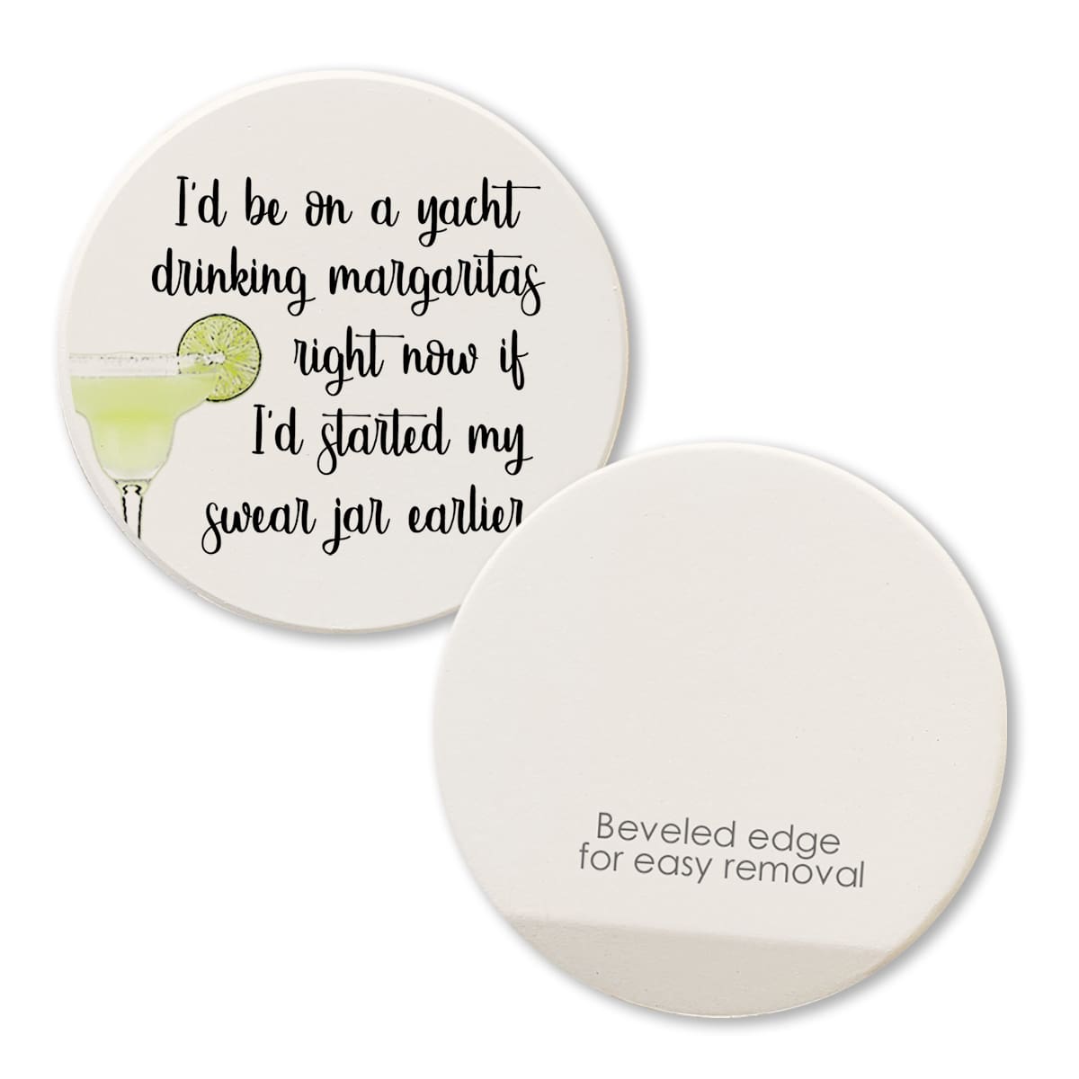 Keep your cup holders clean and dry with these 2.75″ round absorbent car coasters. Permanently printed with high resolution graphics and humorous sayings that won’t fade or wear off. Made in America of absorbent ceramic. Fits most cup holders.