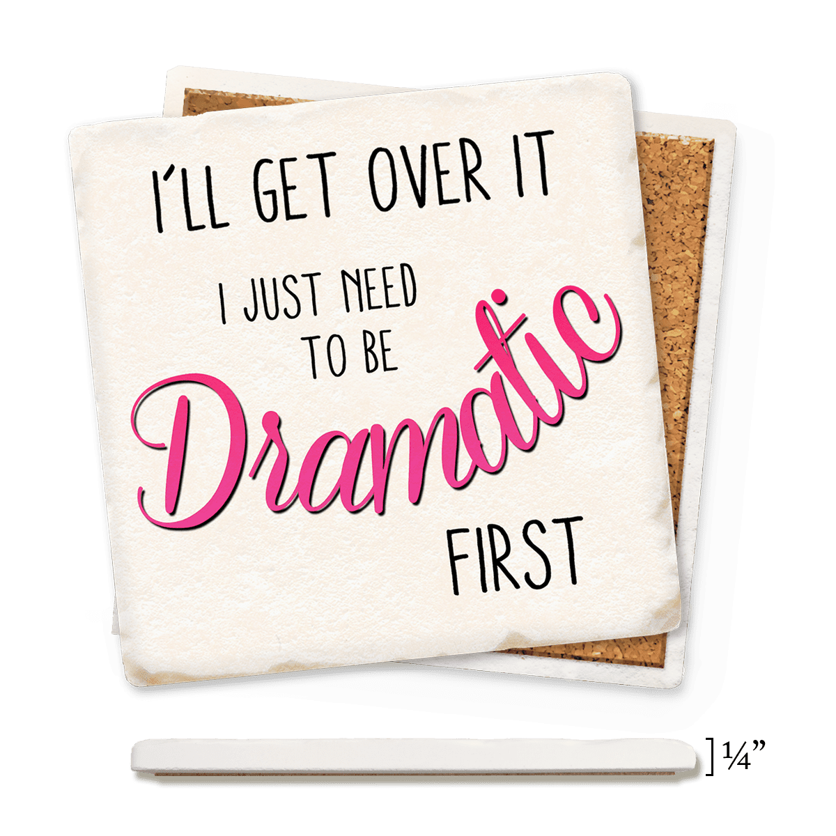 Funny and absorbent 4″ x 4″ coaster. Condensation disappears before your eyes! Printed with high-res graphics and humorous sayings that won’t fade or wear off. Made in America of smooth, thin, lightweight ceramic with full-coverage cork backing.