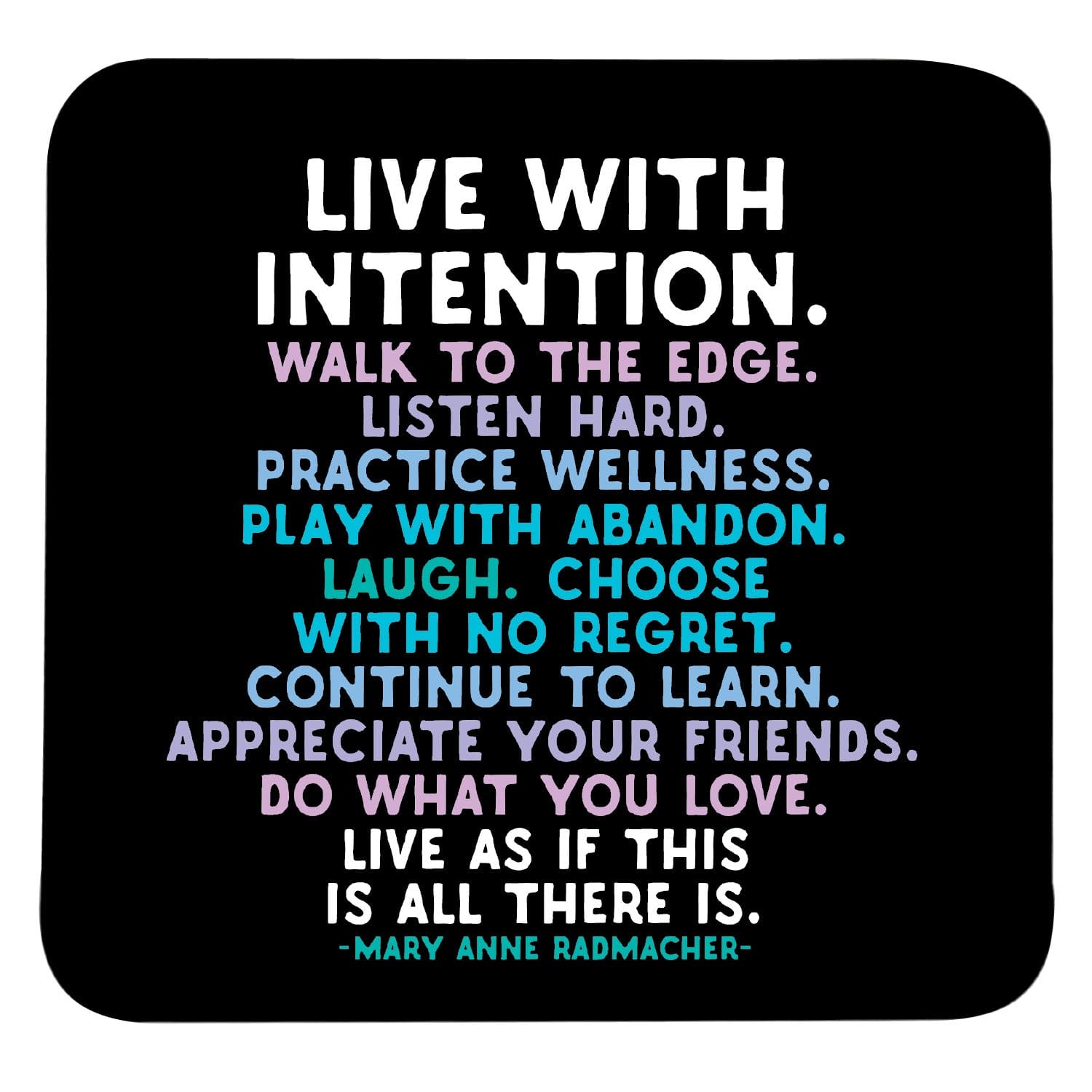4×4″ med-density fiberboard, black felt back: live with intention/walk to the edge/listen hard/practice wellness/play with abandon/laugh/choose with no regret/continue to learn/appreciate your friends/do what you love/live as if this is all there is