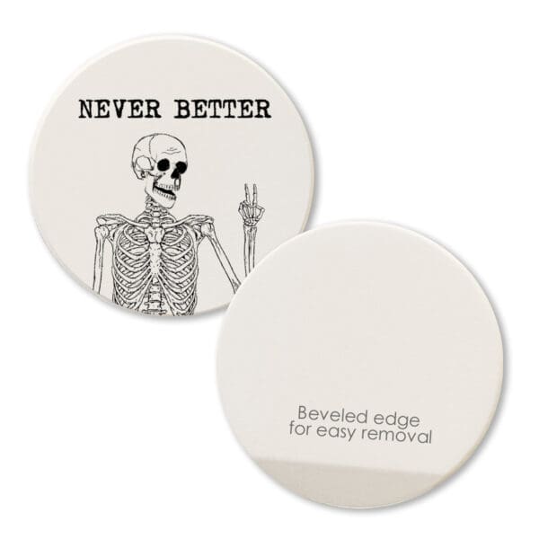 Keep your cup holders clean and dry with these 2.75″ round absorbent car coasters. Permanently printed with high resolution graphics and humorous sayings that won’t fade or wear off. Made in America of absorbent ceramic. Fits most cup holders.