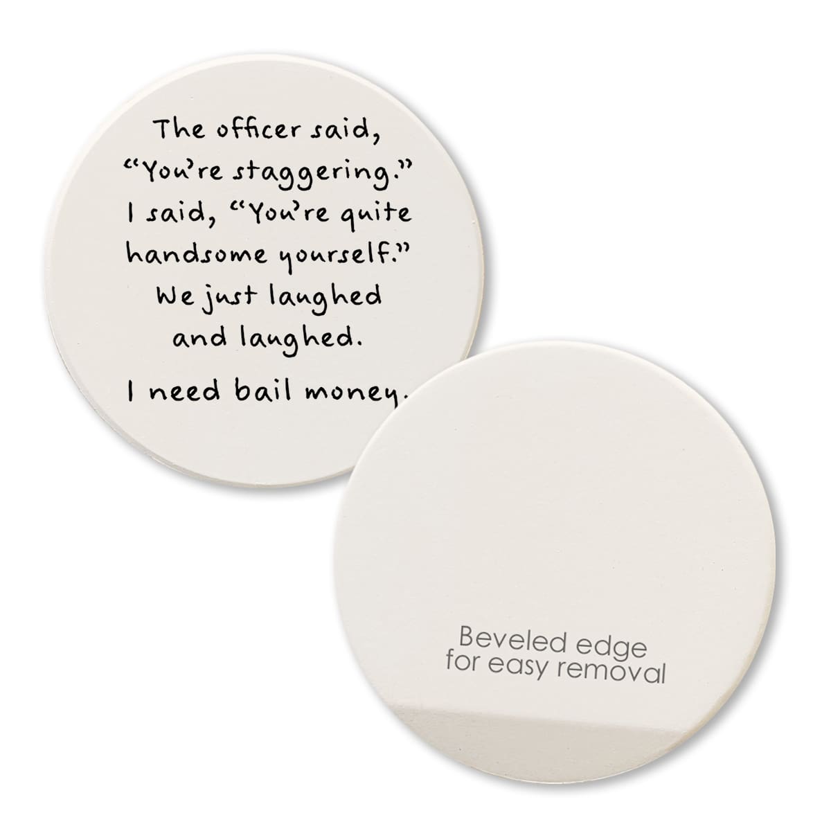 Keep your cup holders clean and dry with these 2.75″ round absorbent car coasters. Permanently printed with high resolution graphics and humorous sayings that won’t fade or wear off. Made in America of absorbent ceramic. Fits most cup holders.