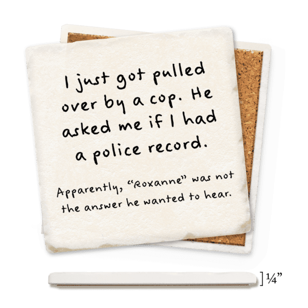Funny and absorbent 4″ x 4″ coaster. Condensation disappears before your eyes! Printed with high-res graphics and humorous sayings that won’t fade or wear off. Made in America of smooth, thin, lightweight ceramic with full-coverage cork backing.