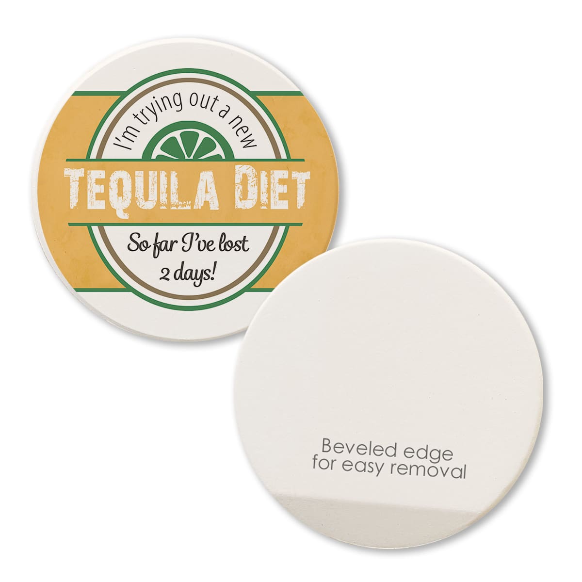 Keep your cup holders clean and dry with these 2.75″ round absorbent car coasters. Permanently printed with high resolution graphics and humorous sayings that won’t fade or wear off. Made in America of absorbent ceramic. Fits most cup holders.