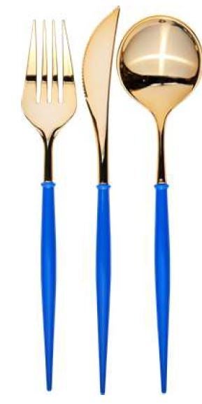 This disposable plastic cutlery features a sleek modern design and blue handle that elevates any table, place setting, or event. Made with food-safe, BPA free plastic. Dishwasher safe. Includes 24pcs.