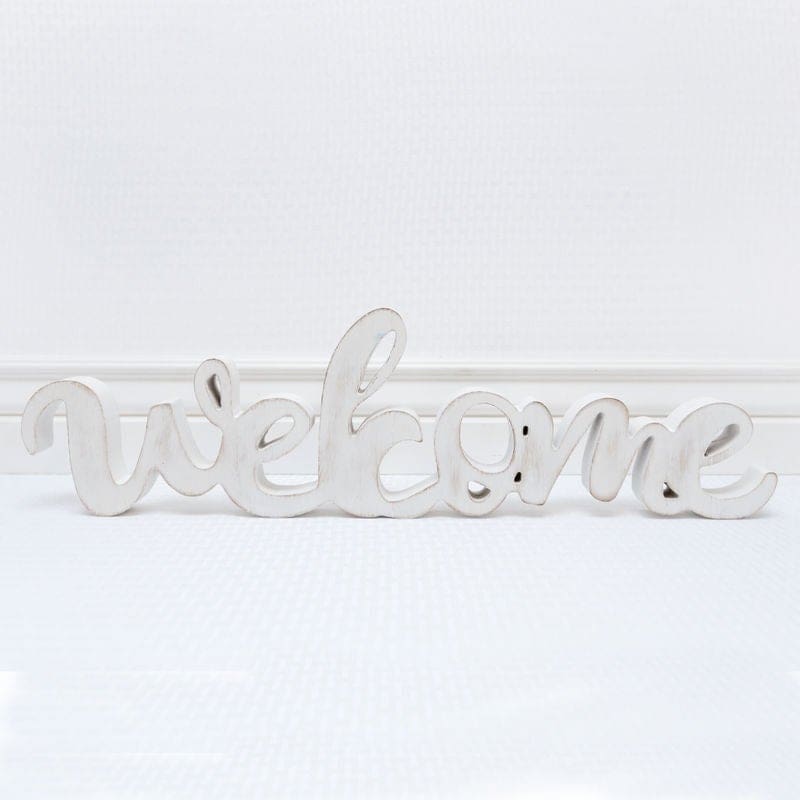 This simplistic wooden cut-out comes in antique brushed colors of classic white, and measures 2″x 6.5″x 0.5″. It reads “Welcome.”