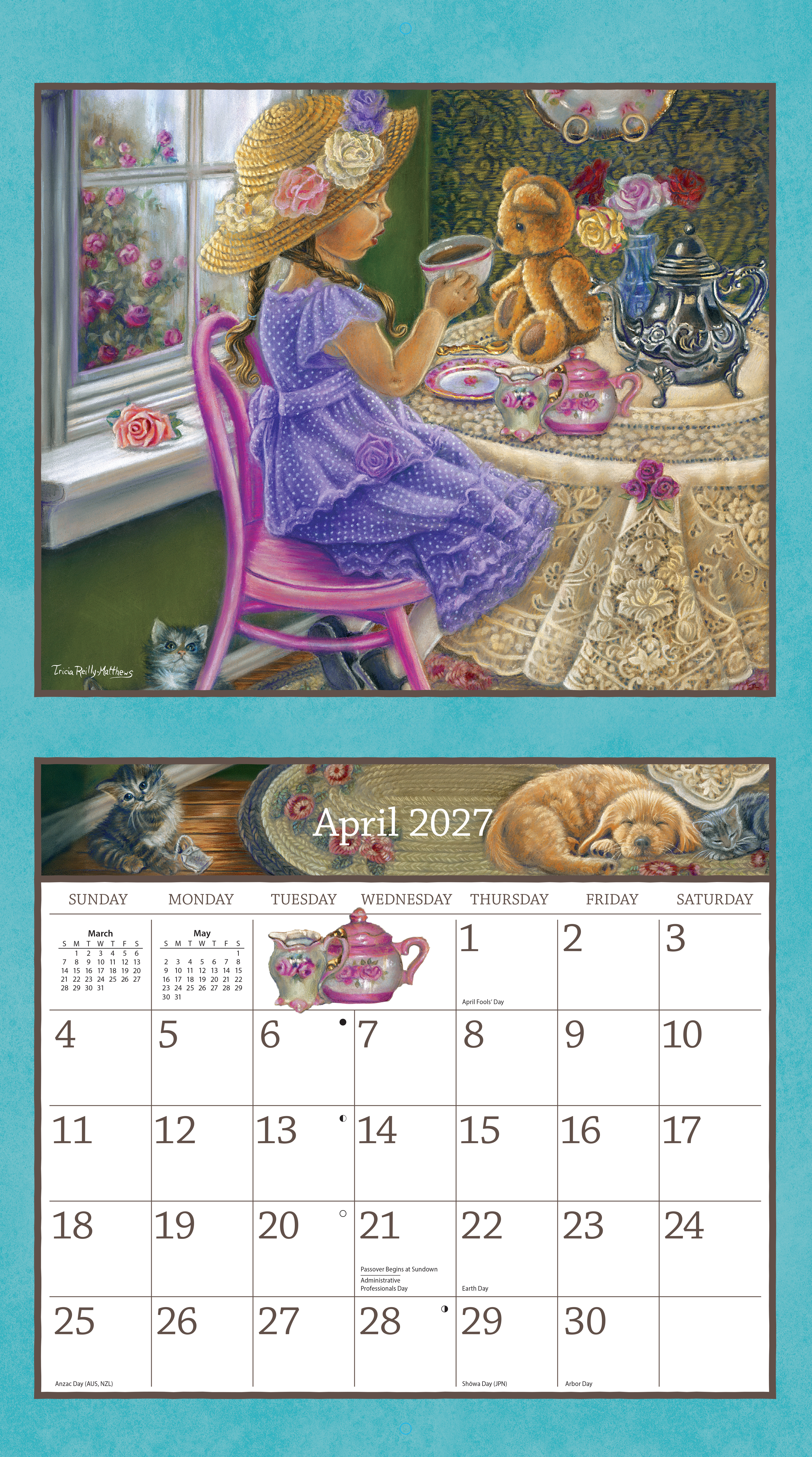 12-month format (Jan-Dec 2027). Nationally recognized artists. Cal size: 13.375″w x 24″h (opened). Includes matching gift jacket, size: 14″wx12.5h. Elegant linen-embossed paper stock w/grommets.