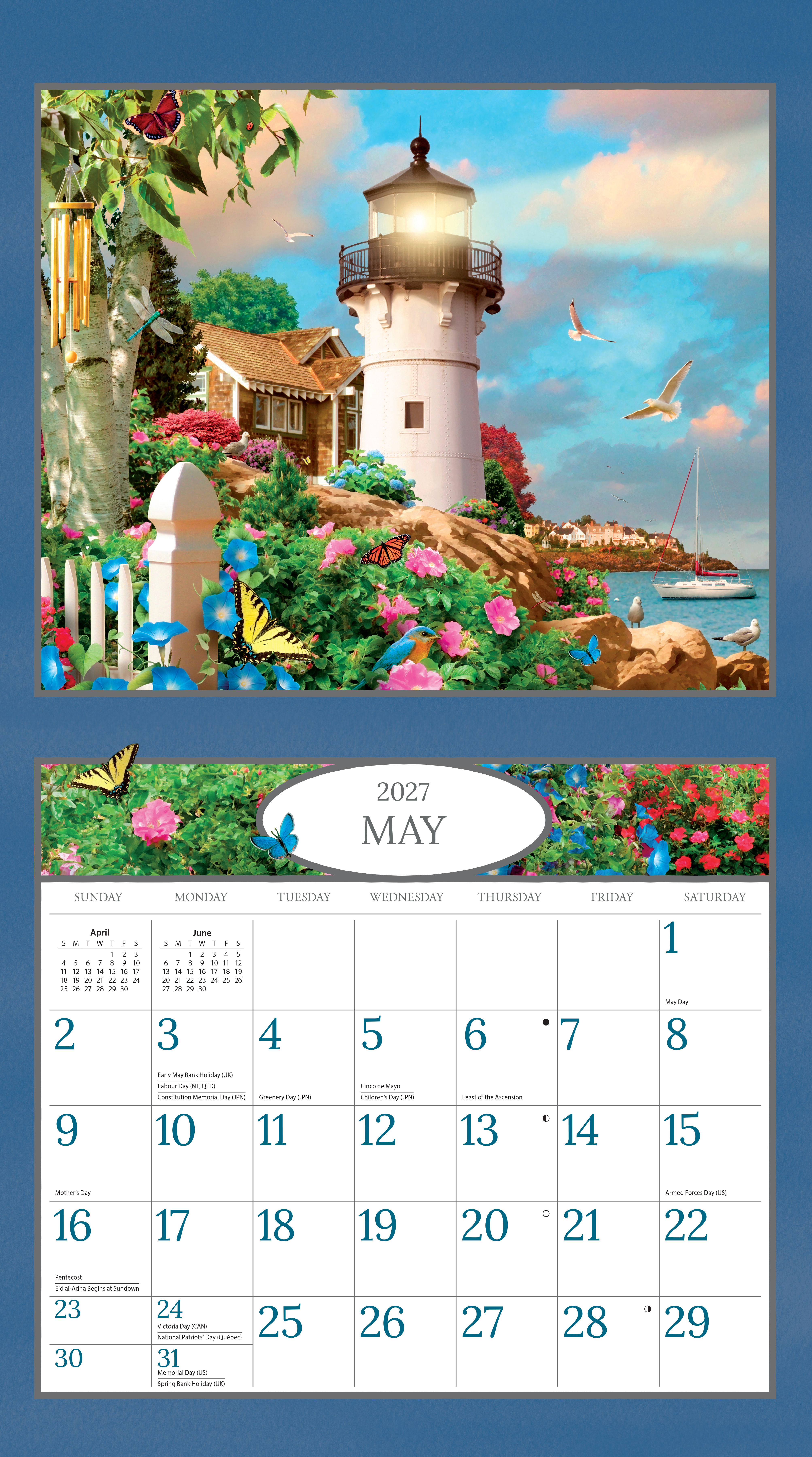 12-month format (Jan-Dec 2027). Nationally recognized artists. Cal size: 13.375″w x 24″h (opened). Includes matching gift jacket, size: 14″wx12.5h. Elegant linen-embossed paper stock w/grommets.