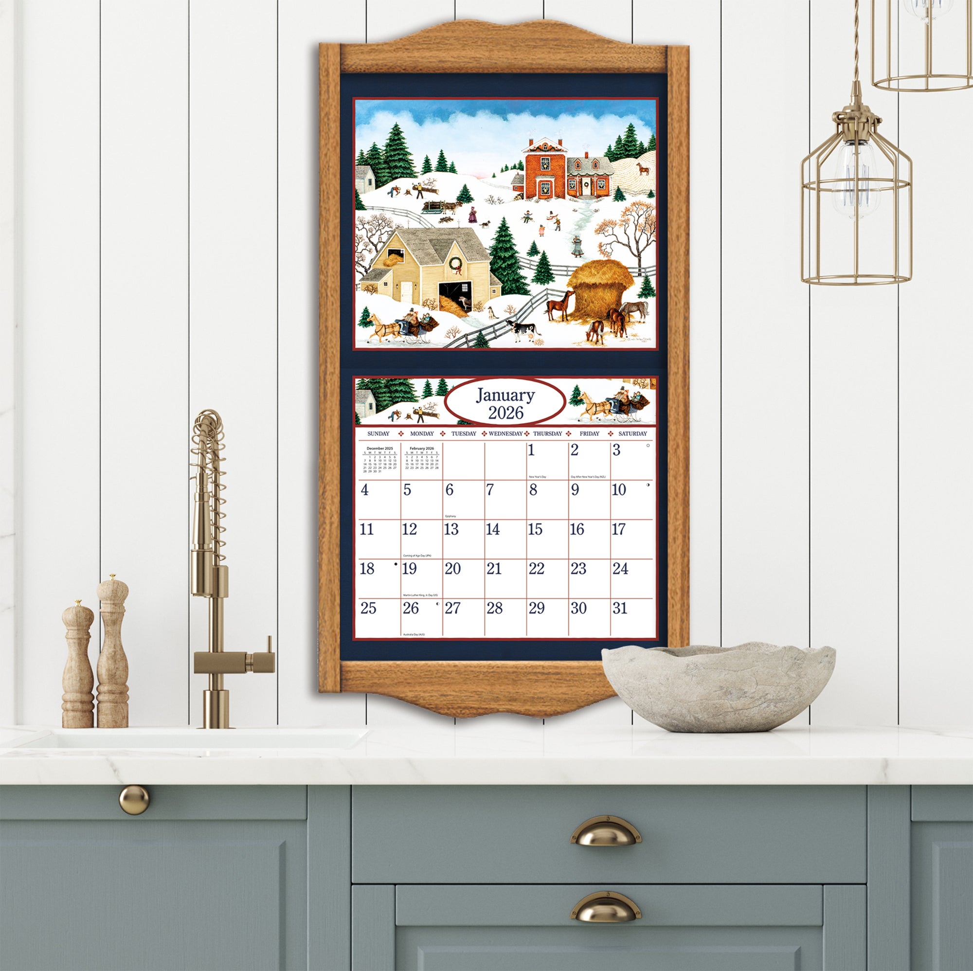 12-month format (Jan-Dec 2026). Nationally recognized artists. Cal size: 13.375″w x 24″h (opened). Includes matching gift jacket, size: 14″wx12.5h. Elegant linen-embossed paper stock w/grommets.