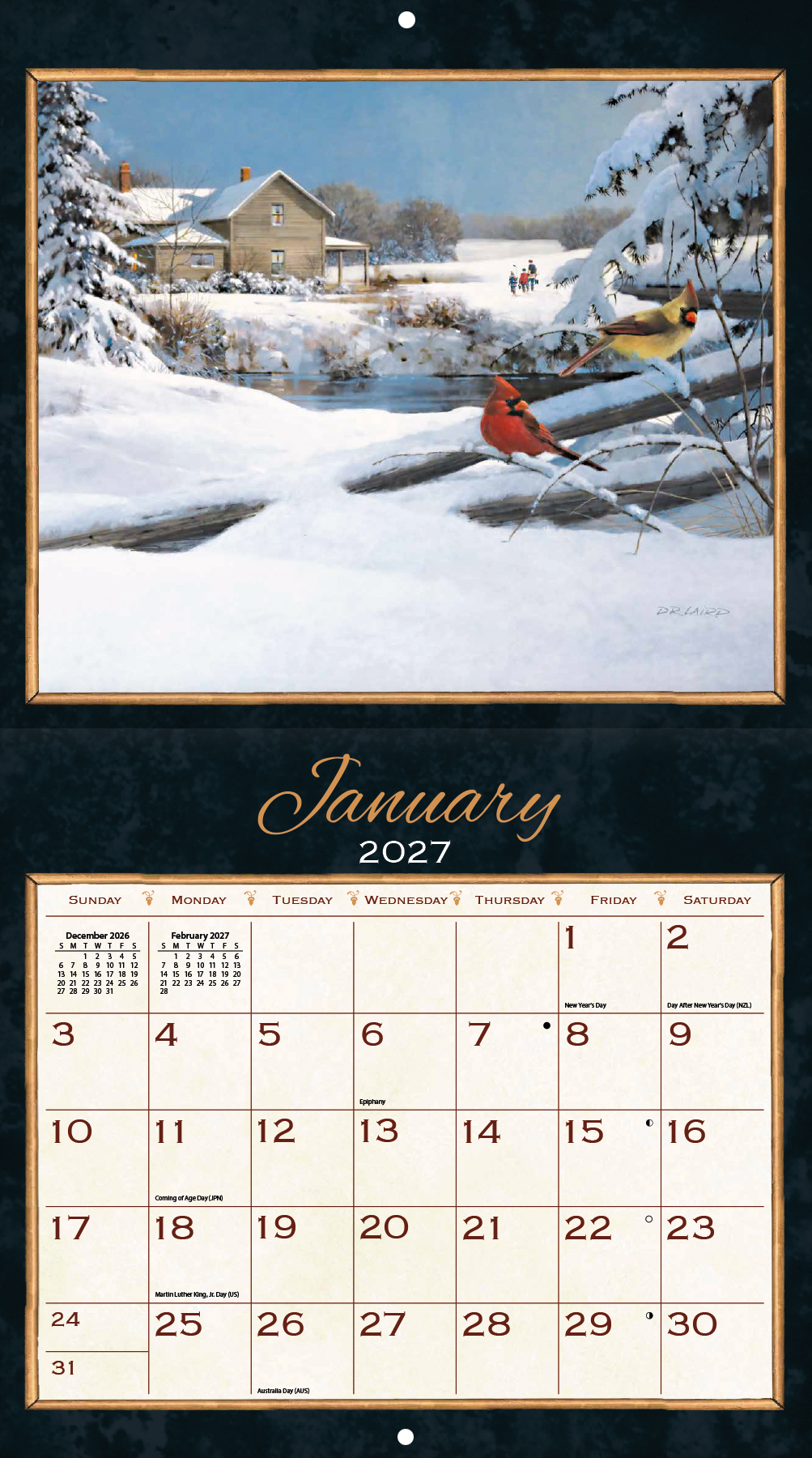 12-month format (Jan-Dec 2027). Nationally recognized artists. Cal size: 13.375″w x 24″h (opened). Includes matching gift jacket, size: 14″wx12.5h. Elegant linen-embossed paper stock w/grommets.