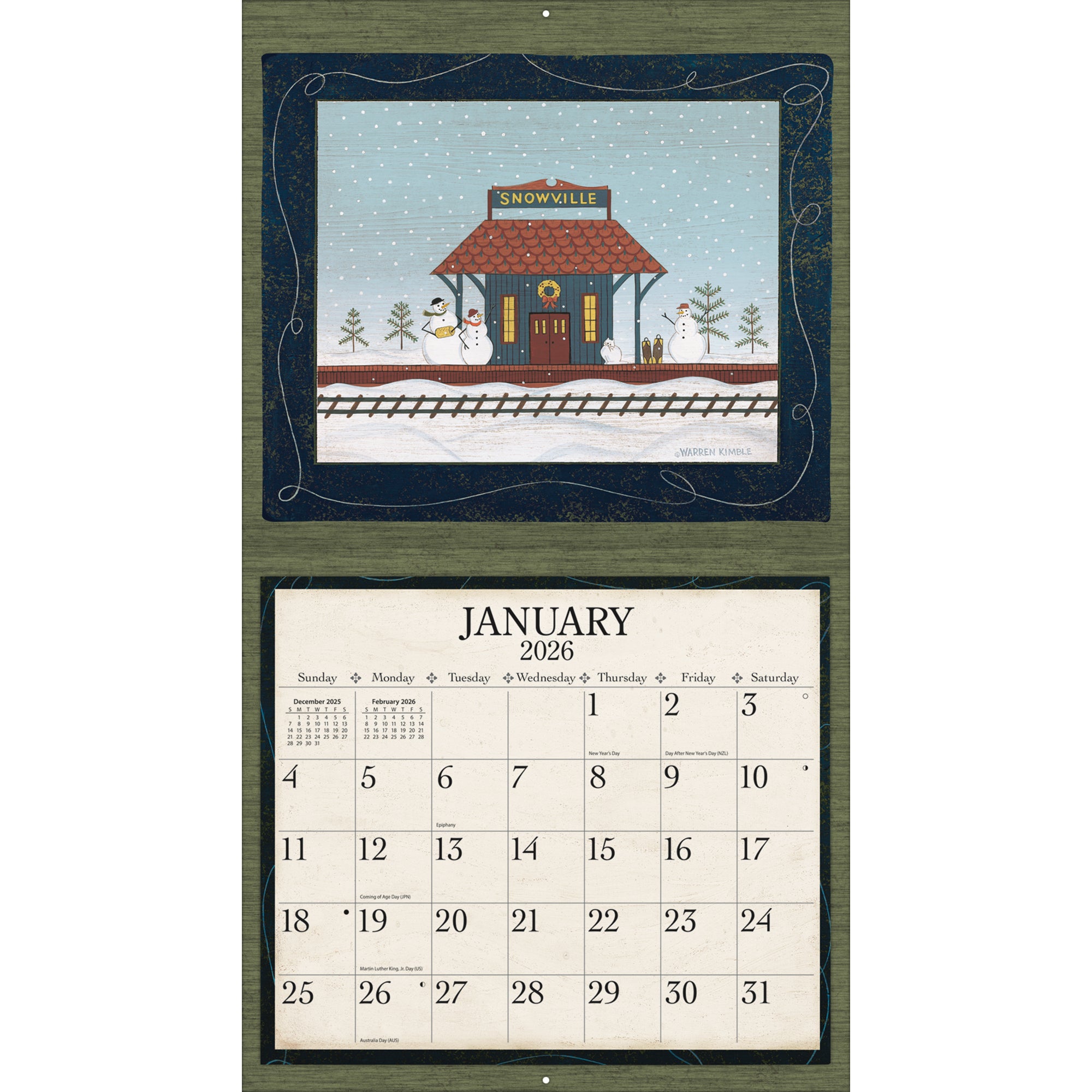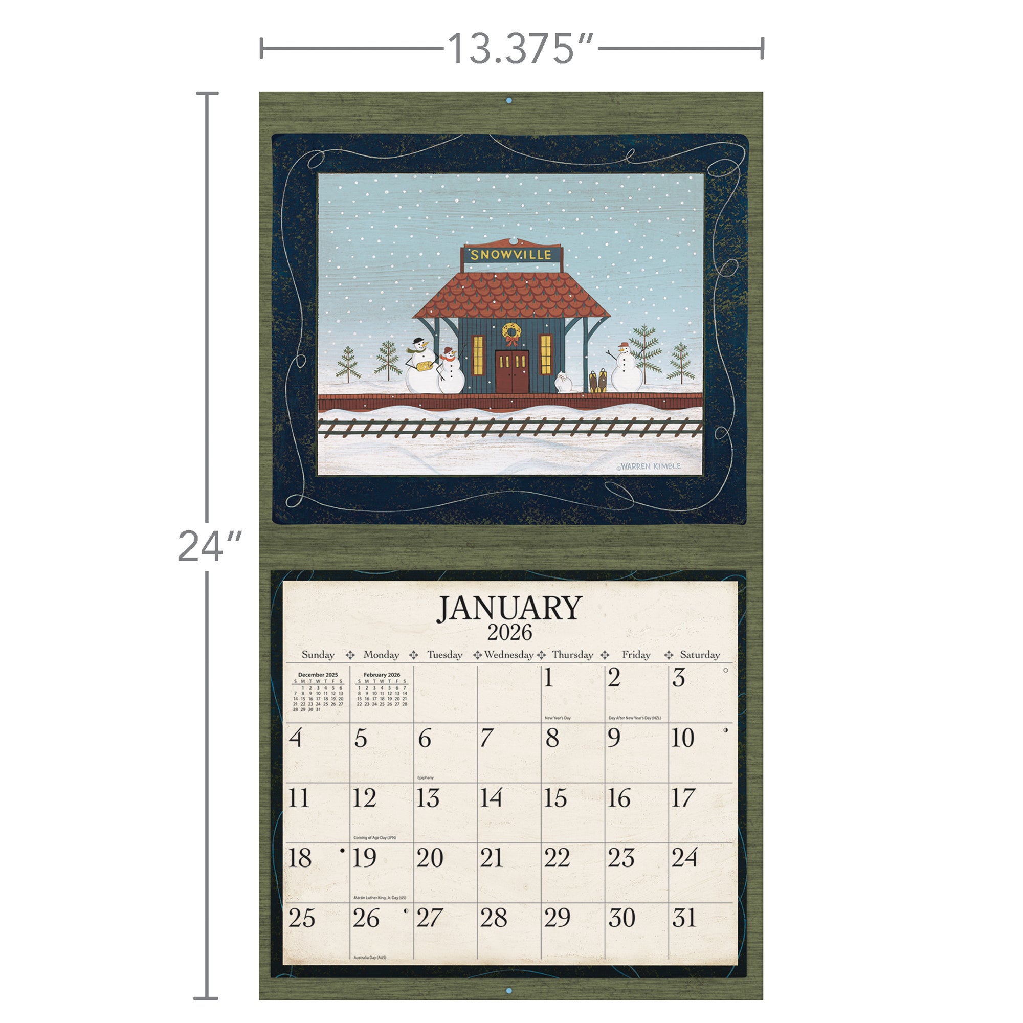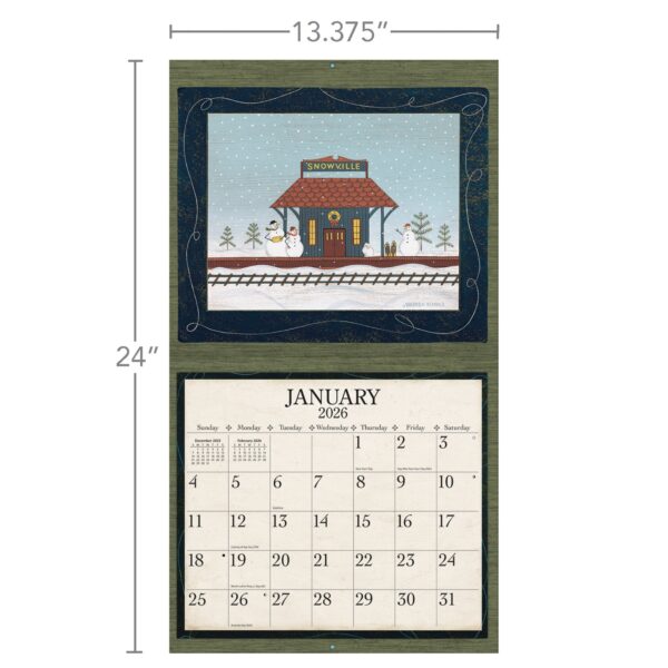 12-month format (Jan-Dec 2026). Nationally recognized artists. Cal size: 13.375″w x 24″h (opened). Includes matching gift jacket, size: 14″wx12.5h. Elegant linen-embossed paper stock w/grommets.