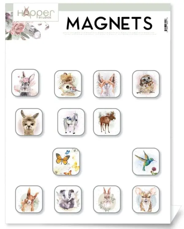 DISPLAY ONLY. Feature your favourite Hopper animals on this powder-coated white counter magnet display. SIZE: 9″ x 12″. Offset when filled with 15 skus x 6 each (90 magnets total). Order 5555P-HOPMAGTOPPER to complete display.